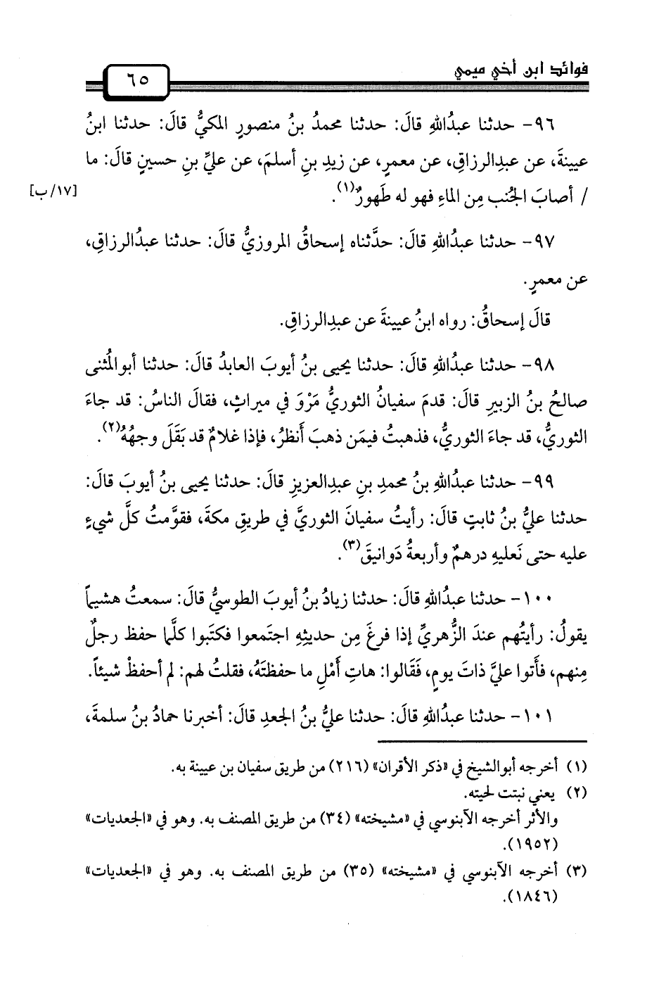 99 - حدثنا عبدُاللهِ بنُ محمدِ بنِ عبدِالعزيزِ قالَ: حَدَّثَنَا يَحْيَى بنُ أيوبَ قالَ: حَدَّثَنَا عليُّ بنُ ثابتٍ قالَ: رأيتُ سفيانَ الثوريَّ فِي طريقِ مكةَ، فقوَّمتُ كلَّ شيءٍ عَلَيْهِ حتى نَعليهِ درهمٌ وأربعةُ دَوانيقَ.