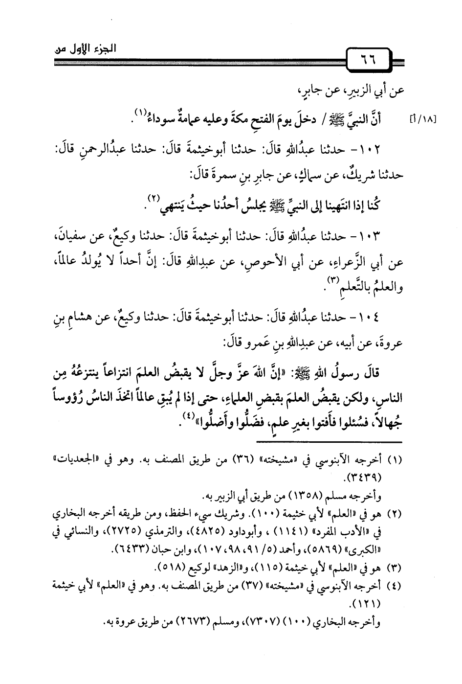 103 - حدثنا عبدُاللهِ قالَ: حدثنا أبوخيثمةَ قالَ: حَدَّثَنَا وكيعٌ، عَنْ سفيانَ، عَنْ أَبِي الزَّعراءِ، عن أبي الأحوصِ، عن عبدِاللهِ قالَ: إنَّ أَحَدًا لا يُولدُ عَالِمًا، والعلمُ بالتَّعلمِ.