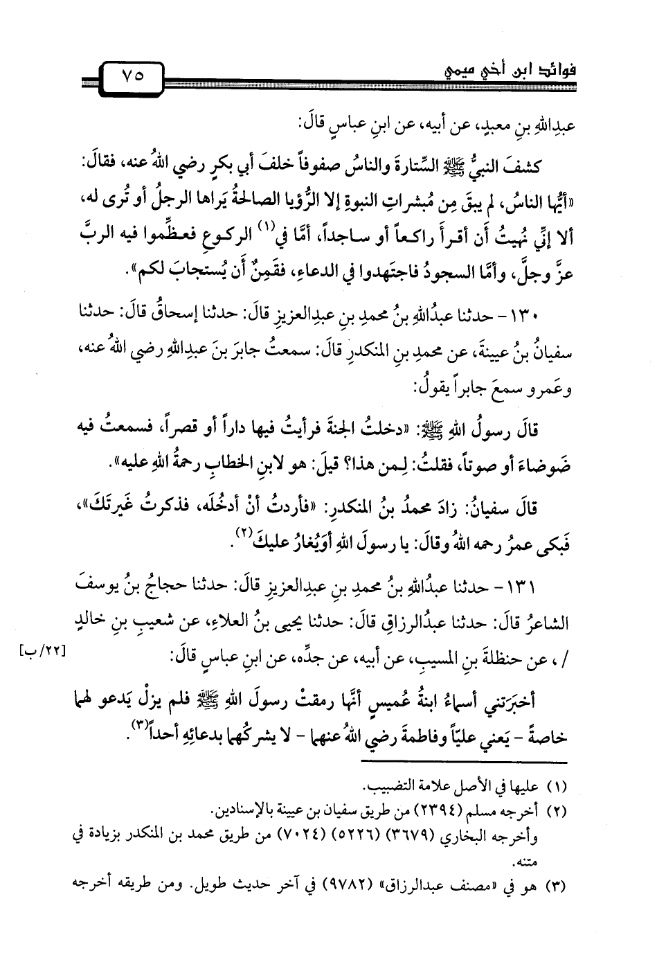 131 - حدثنا عبدُاللهِ بنُ محمدِ بنِ عبدِالعزيزِ قالَ: حَدَّثَنَا حجاجُ بنُ يوسفَ الشاعرُ قالَ: حدثنا عبدُالرزاقِ قالَ: حَدَّثَنَا يَحْيَى بنُ العلاءِ، عَنْ شعيبِ بنِ خالدٍ /، عَنْ حنظلةَ بنِ المسيبِ، عَنْ أَبِيهِ، عَنْ جدِّه، عَنِ ابنِ عباسٍ قالَ: