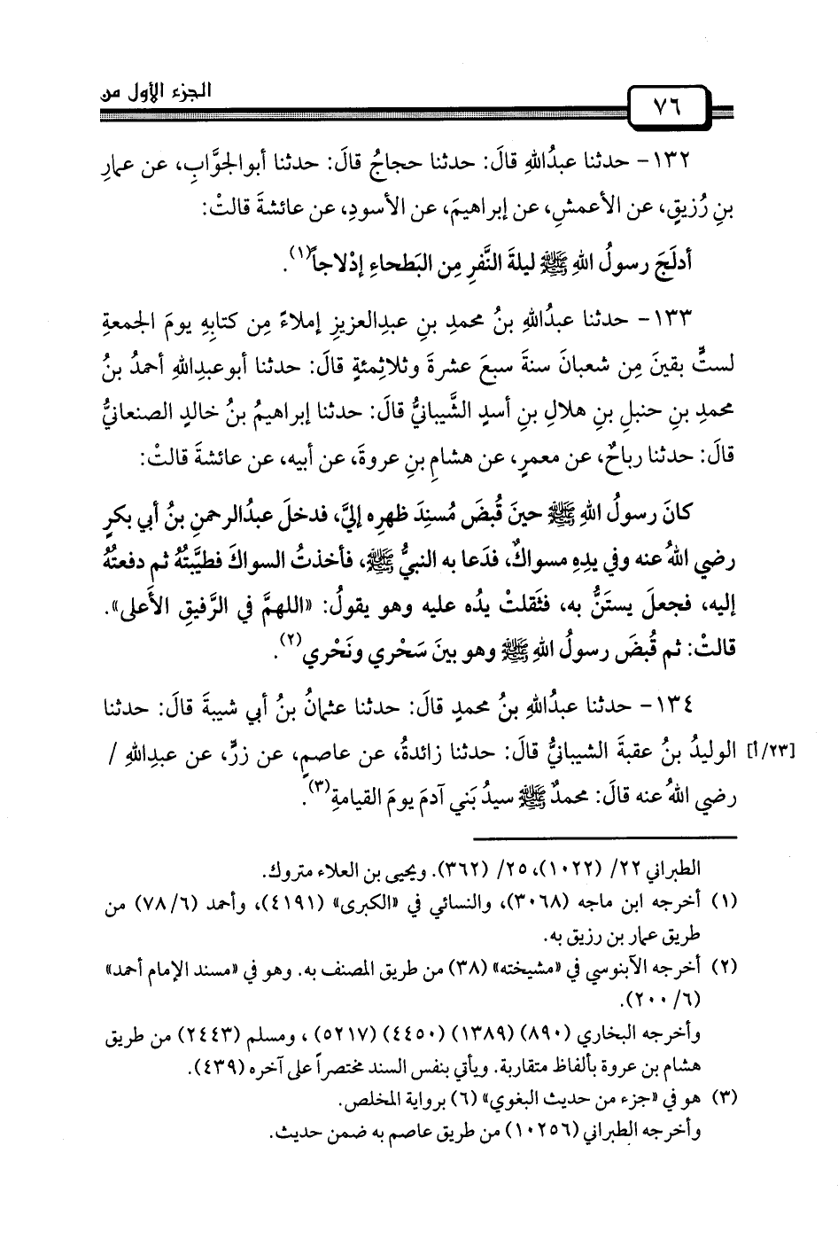 133 - حدثنا عبدُاللهِ بنُ محمدِ بنِ عبدِالعزيزِ إِمْلاءً مِن كتابِهِ يومَ الجمعةِ لستٍّ بقينَ مِن شعبانَ سنةَ سبعَ عشرةَ وثلاثِمئةٍ قالَ: حدثنا أبوعبدِاللهِ أحمدُ بنُ محمدِ بنِ حنبلِ بنِ هلالِ بنِ أسدٍ الشَّيبانيُّ قالَ: حَدَّثَنَا إبراهيمُ بنُ خالدٍ الصنعانيُّ قالَ: حَدَّثَنَا رباحٌ، عَنْ معمرٍ، عَنْ هشامِ بنِ عروةَ، عَنْ أَبِيهِ، عَنْ عائشةَ قالتْ: