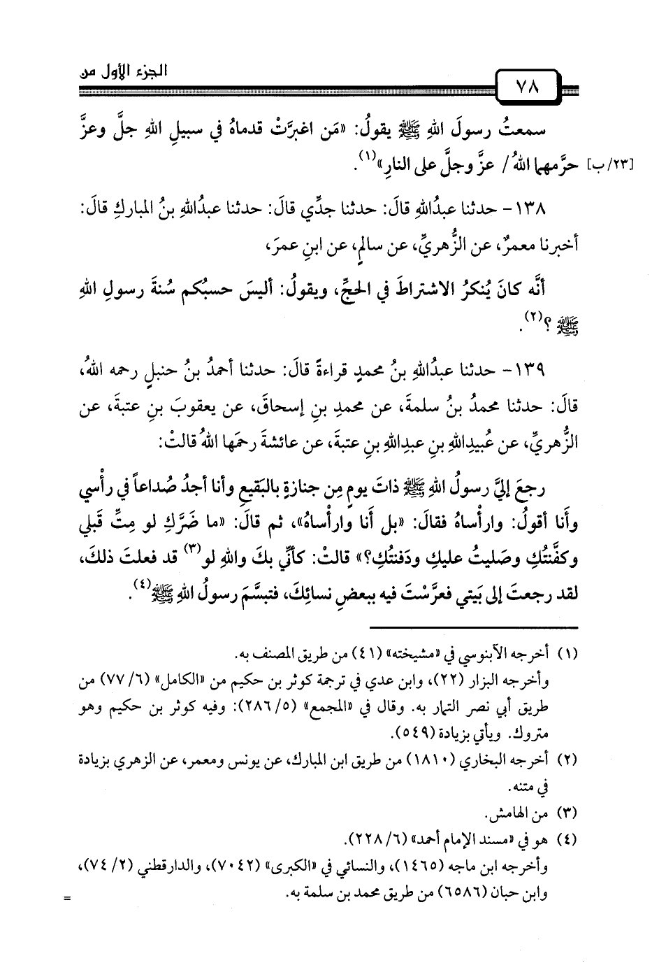 138 - حدثنا عبدُاللهِ قالَ: حدثنا جدِّي قالَ: حدثنا عبدُاللهِ بنُ المباركِ قالَ: أَخْبَرَنَا معمرٌ، عَنِ الزُّهريِّ، عَنْ سالمٍ، عَنِ ابنِ عمرَ،