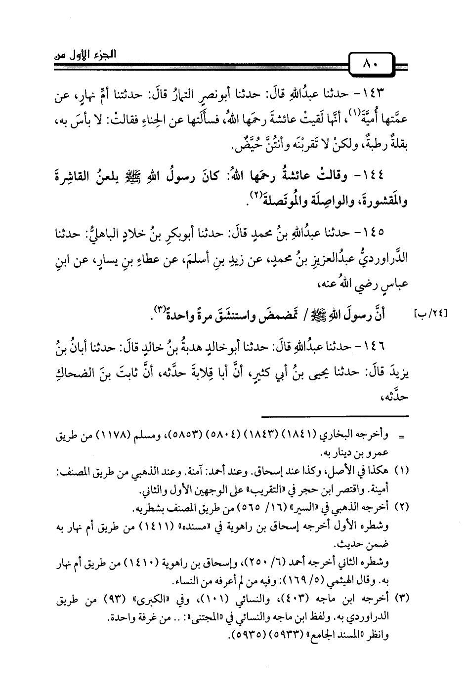 143 - حدثنا عبدُاللهِ قالَ: حدثنا أبونصرٍ التمارُ قالَ: حَدَّثَتْنَا أمِّ نهارٍ، عَنْ عمَّتها أُميَّةَ، أنَّها لَقيتْ عائشةَ رحمَها اللهُ، فسأَلَتها عَنِ الحِناءِ فقالتْ: لا بأسَ بِهِ، بقلةٌ رطبةٌ، ولكنْ لا تَقربْنَه وأنتُنَّ حُيَّضٌ.