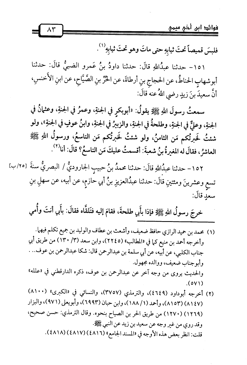 151 - حدثنا عبدُاللهِ قالَ: حَدَّثَنَا داودُ بنُ عَمرو الضبيُّ قالَ: حدثنا أبوشهابٍ الحناطُ، عَنِ الحجاجِ بنِ أرطاةَ، عَنِ الحُرِّ بنِ الصَّيَّاحِ، عَنِ ابنِ الأَخنسِ، أنَّ سعيدَ بنَ زيدٍ رَضِيَ اللهُ عَنْهُ قالَ: