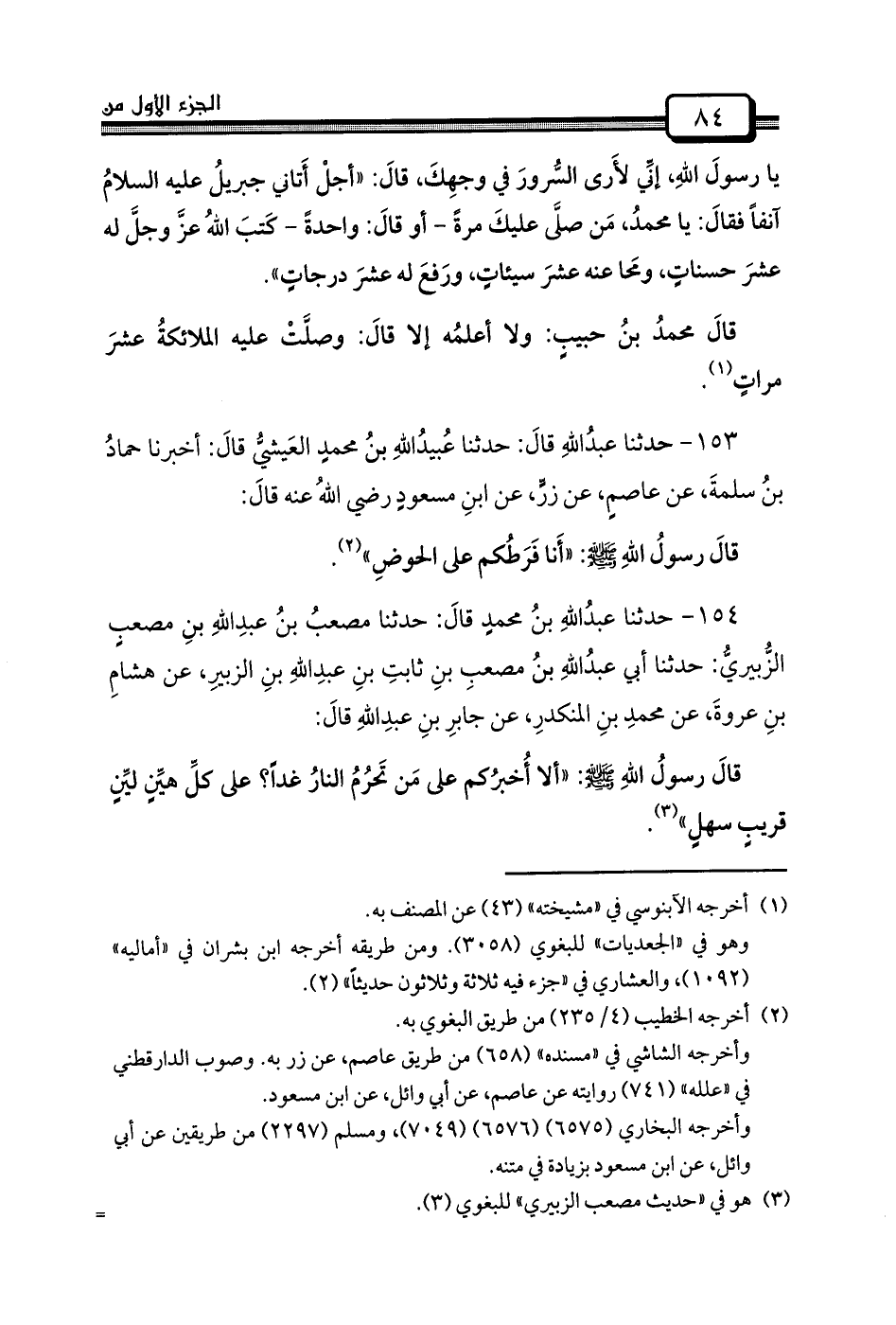 154 - حدثنا عبدُاللهِ بنُ محمدٍ قالَ: حدثنا مصعبُ بنُ عبدِاللهِ بنِ مصعبٍ الزُّبيريُّ: حدثنا أبي عبدُاللهِ بنُ مصعبِ بنِ ثابتِ بنِ عبدِاللهِ بنِ الزبيرِ، عَنْ هشامِ بنِ عروةَ، عَنْ محمدِ بنِ المنكدرِ، عن جابرِ بنِ عبدِاللهِ قالَ: