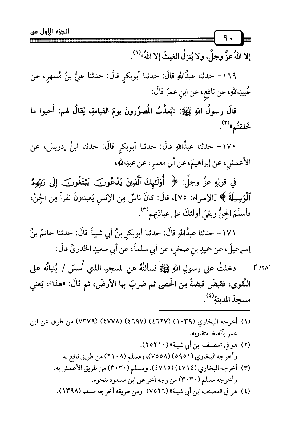 170 - حدثنا عبدُاللهِ قالَ: حدثنا أبوبكرٍ قالَ: حَدَّثَنَا ابنُ إدريسَ، عَنِ الأعمشِ، عَنْ إبراهيمَ، عن أبي معمرٍ، عن عبدِاللهِ،