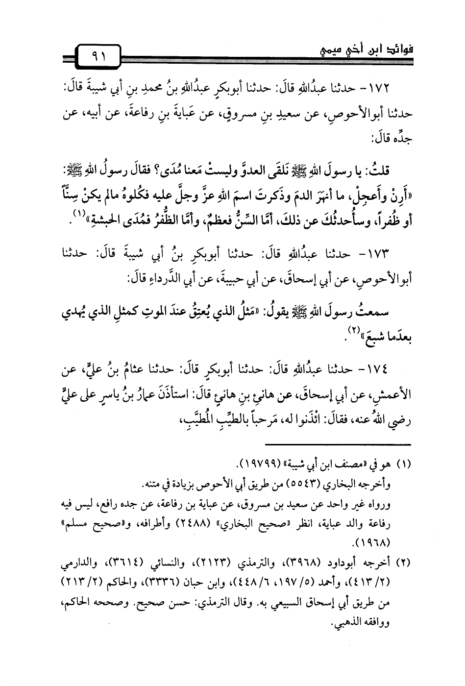 172 - حدثنا عبدُاللهِ قالَ: حدثنا أبوبكرٍ عبدُاللهِ بنُ محمدِ بنِ أَبِي شيبةَ قالَ: حَدَّثَنَا أبوالأحوصِ، عَنْ سعيدِ بنِ مسروقٍ، عَنْ عَبايةَ بنِ رفاعةَ، عَنْ أَبِيهِ، عَنْ جدِّه قالَ: