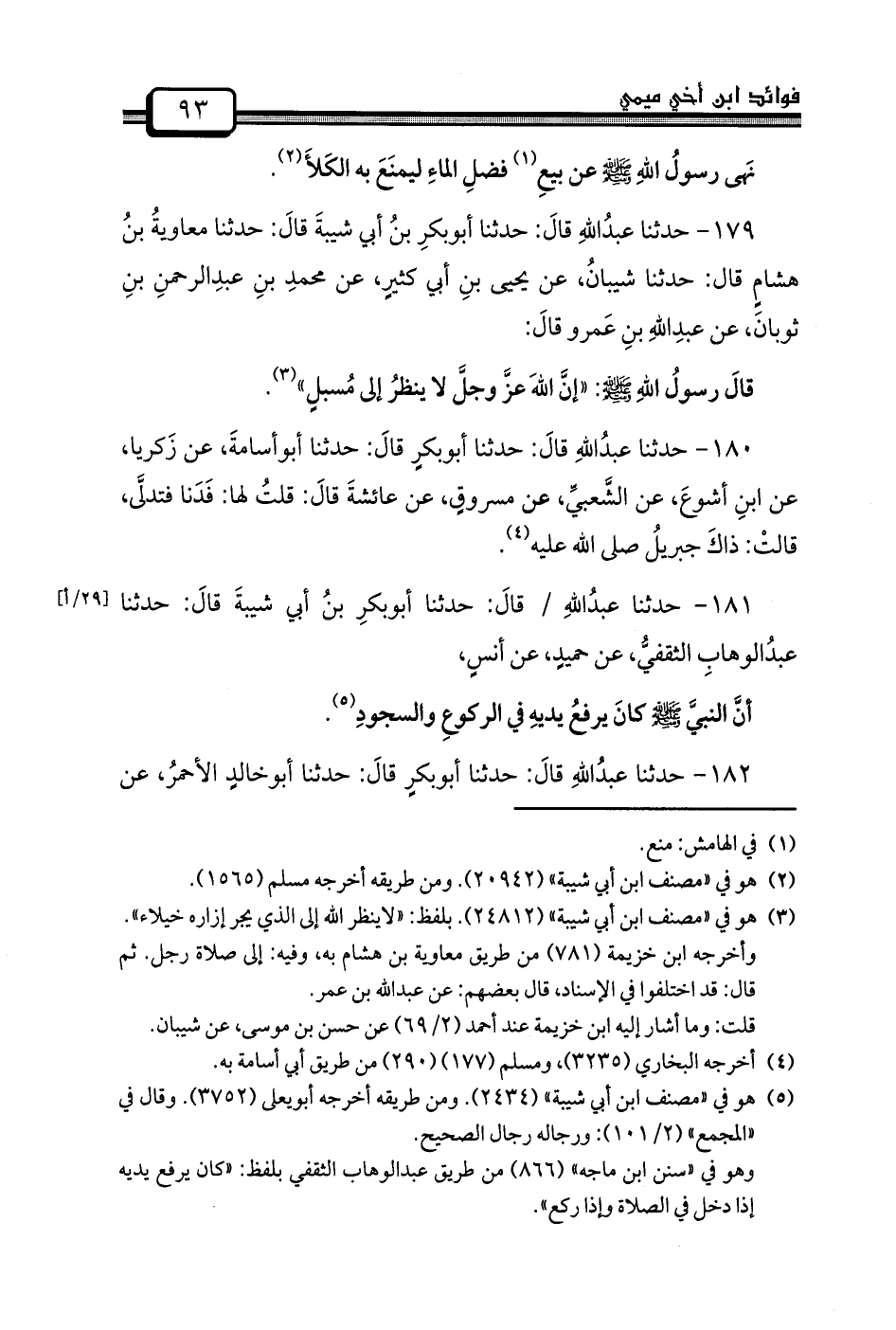 182 - حدثنا عبدُاللهِ قالَ: حدثنا أبوبكرٍ قالَ: حدثنا أبوخالدٍ الأحمرُ، عَنْ -[94]- محمدِ بنِ عجلانَ، عَنْ زيدِ بنِ أسلمَ، عَنْ أَبِي صالحٍ، عَنْ أَبِي هريرةَ قالَ: