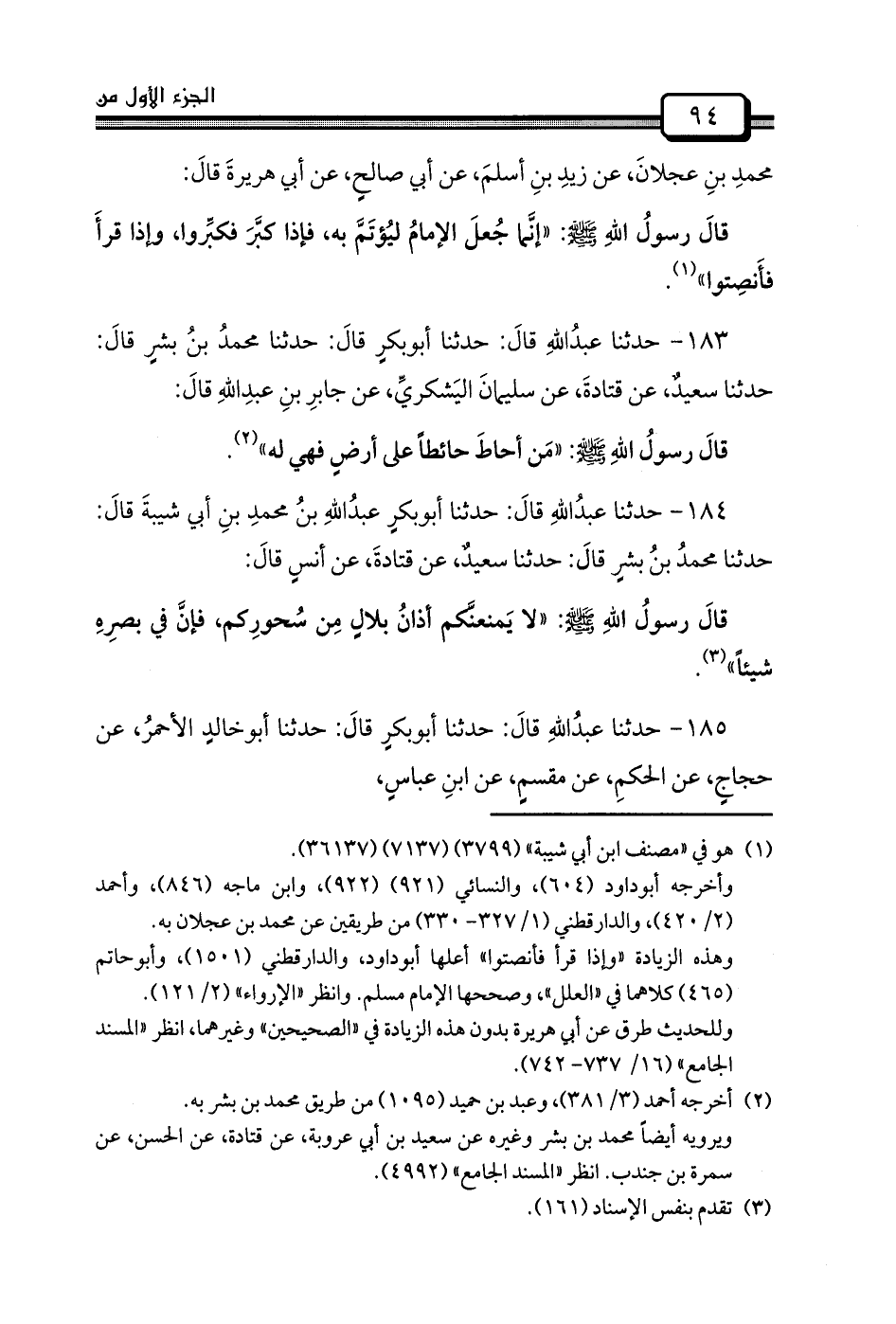 184 - حدثنا عبدُاللهِ قالَ: حدثنا أبوبكرٍ عبدُاللهِ بنُ محمدِ بنِ أَبِي شيبةَ قالَ: حَدَّثَنَا محمدُ بنُ بشرٍ قالَ: حَدَّثَنَا سعيدٌ، عَنْ قتادةَ، عَنْ أنسٍ قالَ: