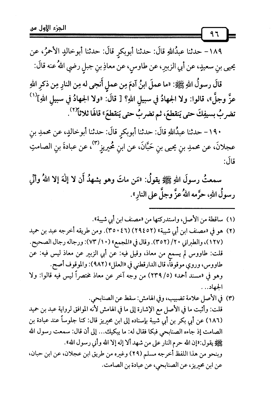 189 - حدثنا عبدُاللهِ قالَ: حدثنا أبوبكرٍ قالَ: حدثنا أبوخالدٍ الأحمرُ، عَنْ يَحْيَى بنِ سعيدٍ، عَنْ أَبِي الزبيرِ، عَنْ طاوسٍ، عَنْ معاذِ بنِ جبلٍ رَضِيَ اللهُ عَنْهُ قالَ: