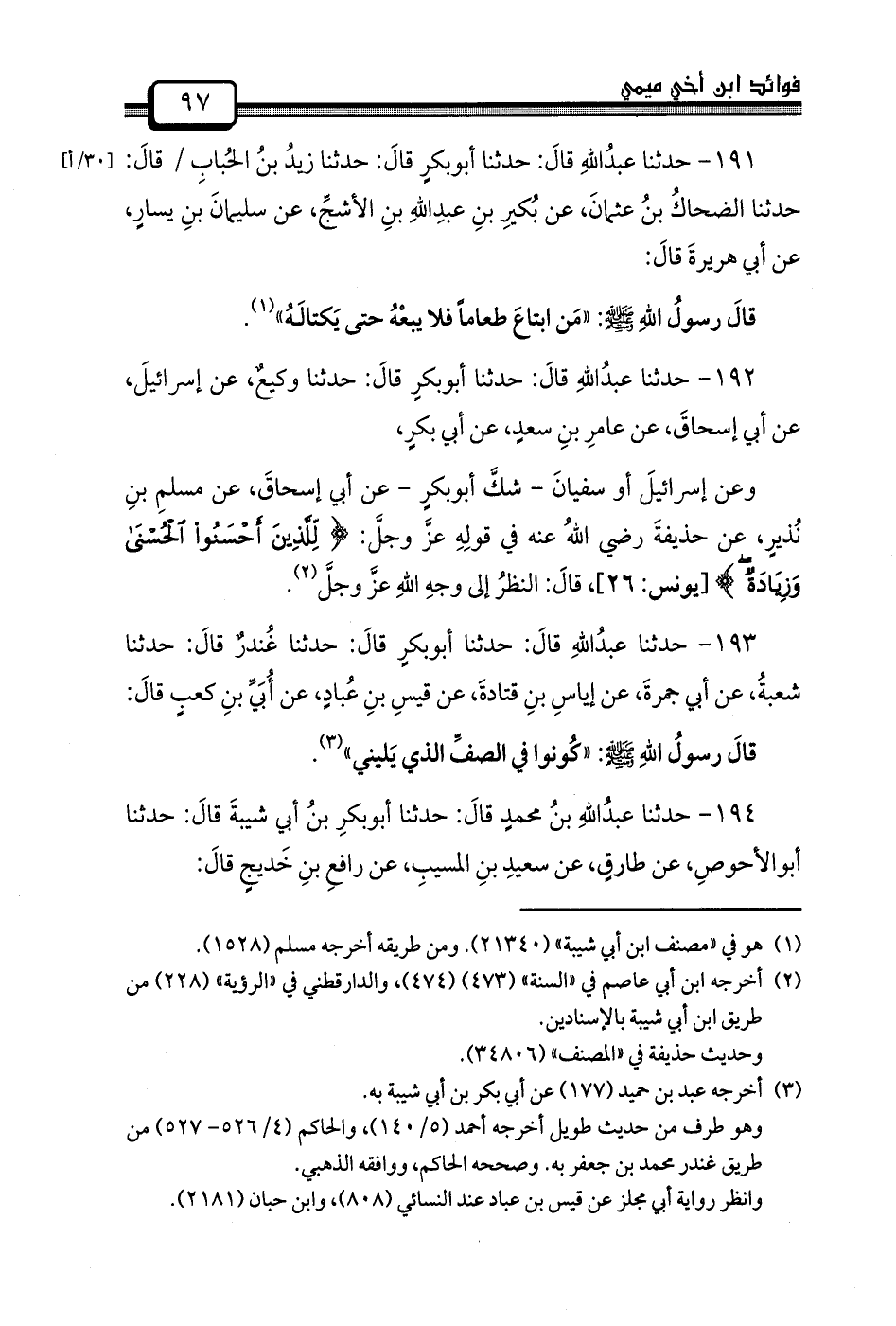 191 - حدثنا عبدُاللهِ قالَ: حدثنا أبوبكرٍ قالَ: حَدَّثَنَا زيدُ بنُ الحُبابِ / قالَ: حَدَّثَنَا الضحاكُ بنُ عثمانَ، عن بُكيرِ بنِ عبدِاللهِ بنِ الأشجِّ، عَنْ سليمانَ بنِ يسارٍ، عَنْ أبي هريرةَ قالَ: