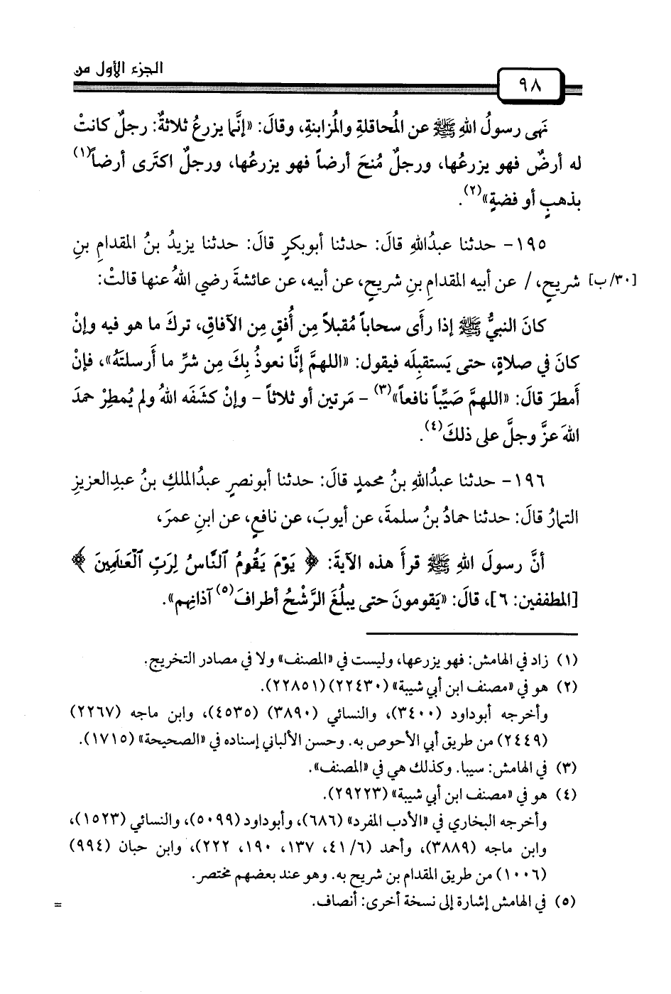 196 - حدثنا عبدُاللهِ بنُ محمدٍ قالَ: حدثنا أبونصرٍ عبدُالملكِ بنُ عبدِالعزيزِ التمارُ قالَ: حَدَّثَنَا حمادُ بنُ سلمةَ، عَنْ أيوبَ، عن نافعٍ، عن ابنِ عمرَ،