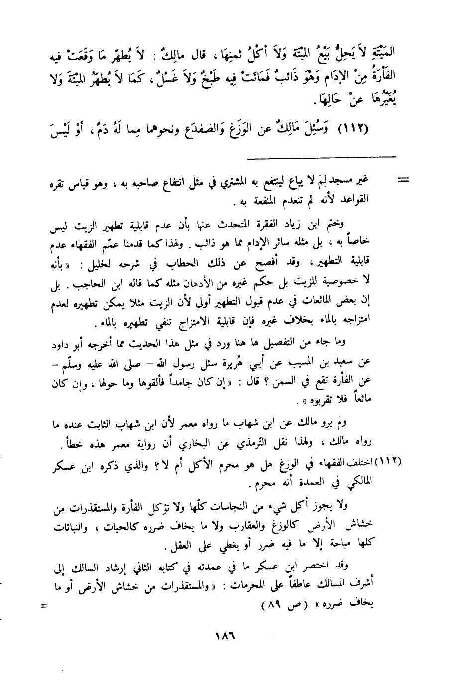 112- وسئل مالكٌ عن الوزغ والضفدع ونحوهما مما له دمٌ، أو ليس #187# له دمٌ تقع في زيتٍ فتموت فيه، قال مالكٌ: الوزغ عندي بمنزلة الفأرة. وأما #188# الضفدع فأراها شبه الحيتان عندي وما يكون في البحار، وقد أحل الله صيد البحر وهو يؤكل ميتاً، وحياً ولا أرى بما ماتت فيه بأساً.