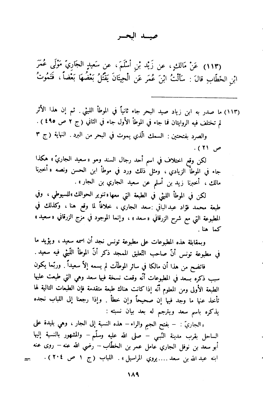 113- عن مالكٍ، عن زيد بن أسلم، عن سعيدٍ الجاري مولى عمر بن الخطاب قال: سألت ابن عمر عن الحيتان يقتل بعضها بعضاً، فتموت #190# صرداً، فقال: ليس بها بأسٌ. قال سعيدٌ: فسألت عبد الله بن عمرو بن العاص فقال مثل ذلك.