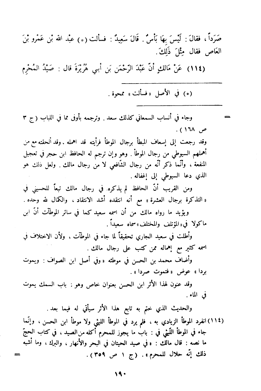 114- عن مالكٍ أن عبد الرحمن بن أبي هريرة قال: صيد المحرم #191# كله حلالاً. قال الله: {أحل لكم صيد البحر وطعامه}. قال مالك صيده: ما اصطيد، وطعامه ما لفظ.