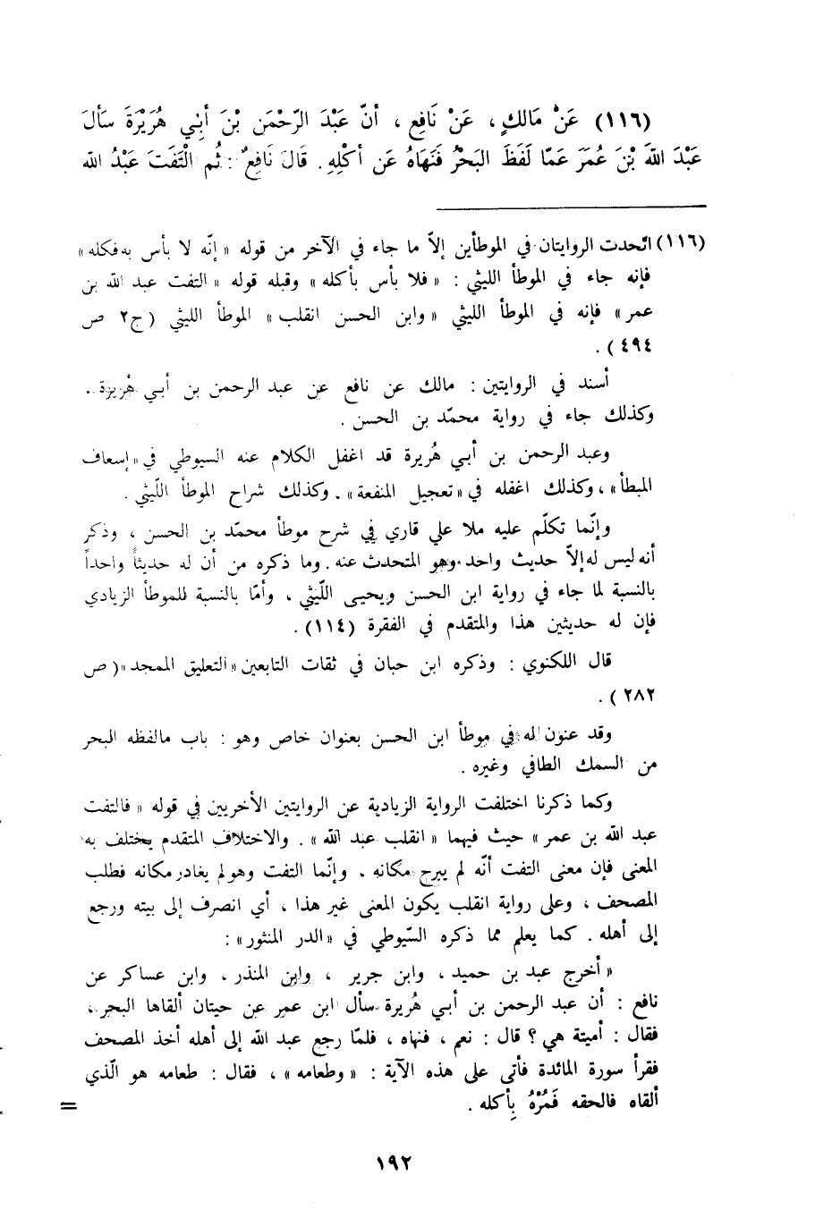 116- عن مالكٍ، عن نافع، أن عبد الرحمن بن أبي هريرة سأل عبد الله بن عمر عما لفظ البحر فنهاه عن أكله. قال نافعٌ: ثم التفت عبد الله #193# بن عمر فدعا بالمصحف فقرأ {أحل لكم صيد البحر وطعامه}. قال نافعٌ: فأرسلني عبد الله بن عمر إلى عبد الرحمن بن أبي هريرة أنه لا بأس به فكله.