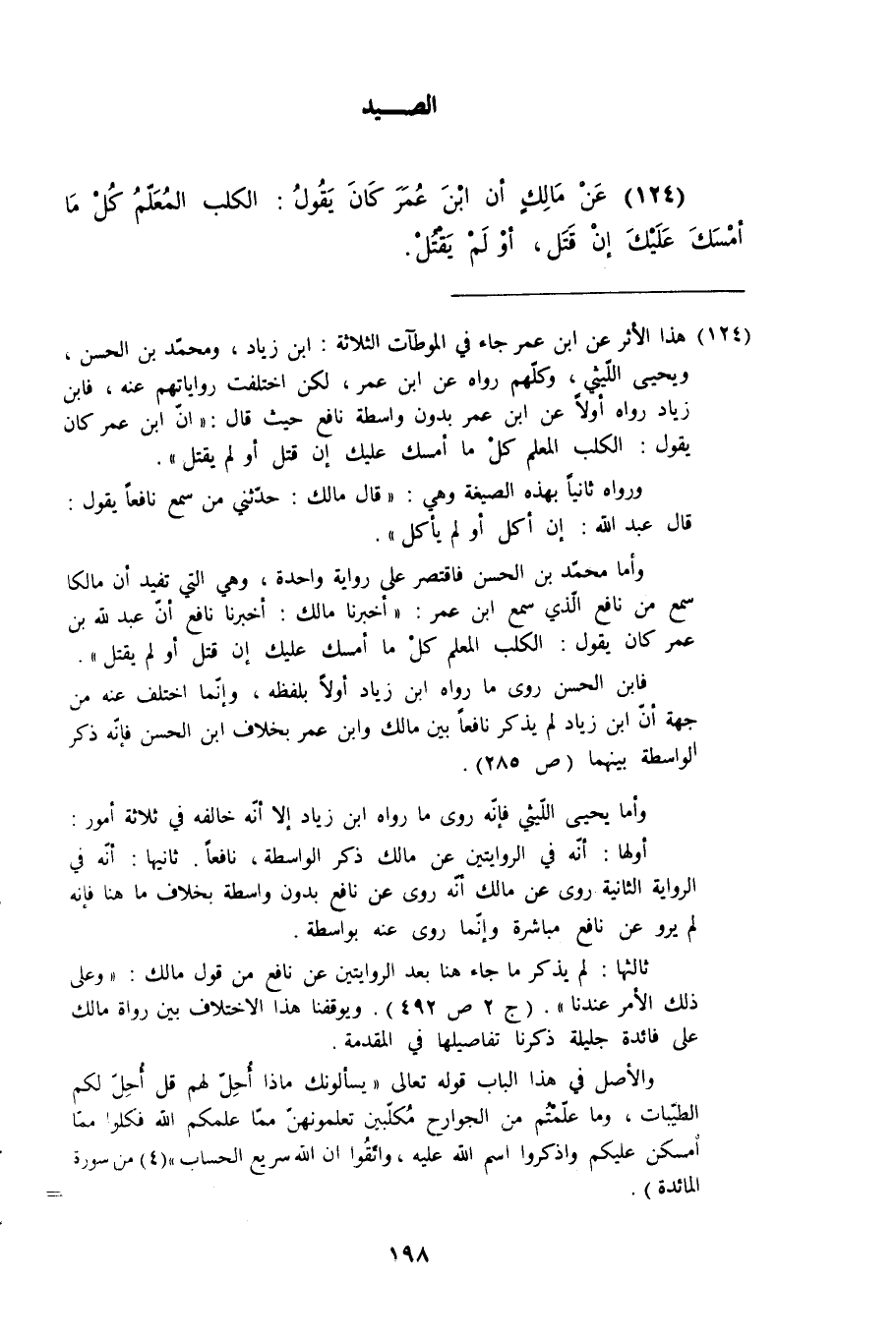 124- عن مالكٍ أن ابن عمر كان يقول: الكلب المعلم كل ما أمسك عليك إن قتل، أو لم يقتل.