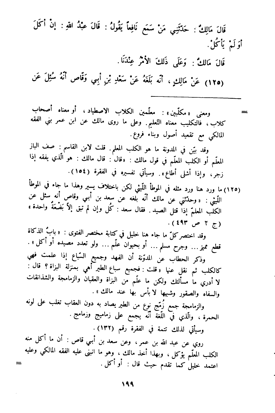 125- عن مالكٍ، أنه بلغه عن سعد بن أبي وقاص أنه سئل عن #200# الكلب المعلم يأخذ الصيد فيأكل منه، فقال: كل وإن لم تبق إلا بضعةٌ واحدةً.