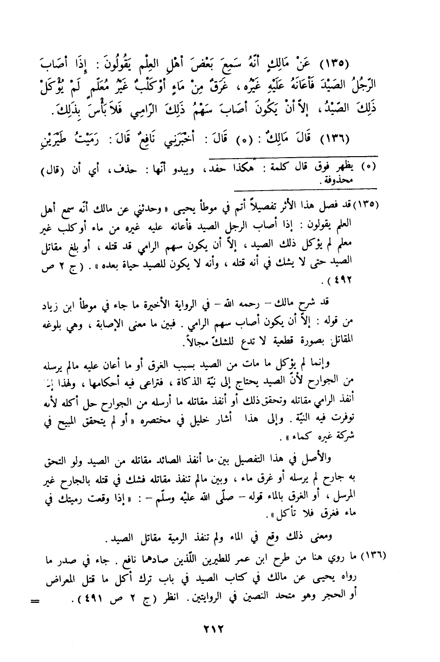 135- عن مالكٍ أنه سمع بعض أهل العلم يقولون: إذا أصاب الرجل الصيد فأعانه عليه غيره، غرقٌ من ماءٍ أو كلبٌ غير معلمٍ لم يؤكل ذلك الصيد، إلا أن يكون أصاب سهم ذلك الرامي فلا بأس بذلك.