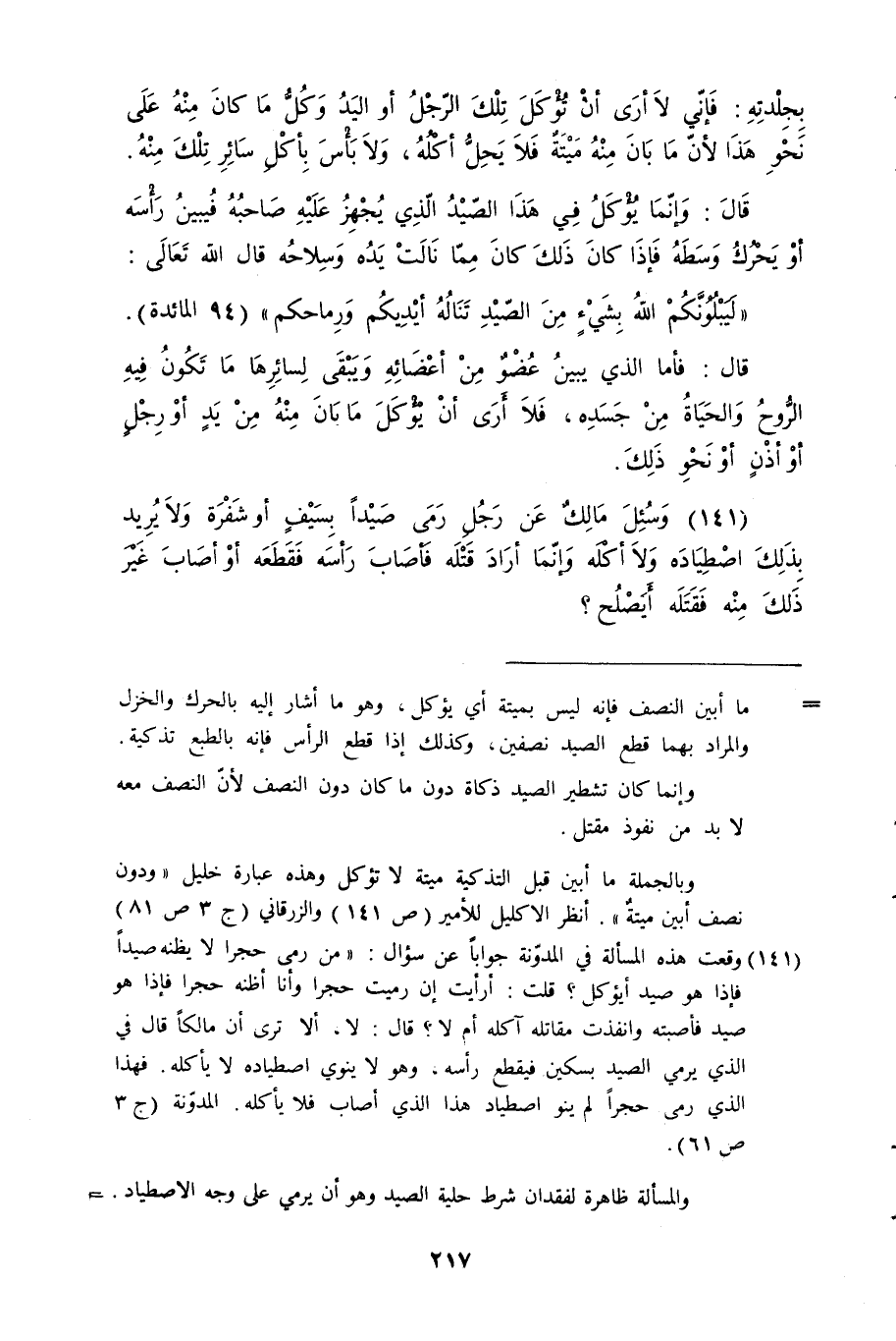 141- وسئل مالكٌ عن رجلٍ رمى صيداً بسيفٍ أو شفرة ولا يريد بذلك اصطياده ولا أكله وإنما أراد قتله فأصاب رأسه فقطعه أو أصاب غير ذلك منه فقتله أيصلح؟.