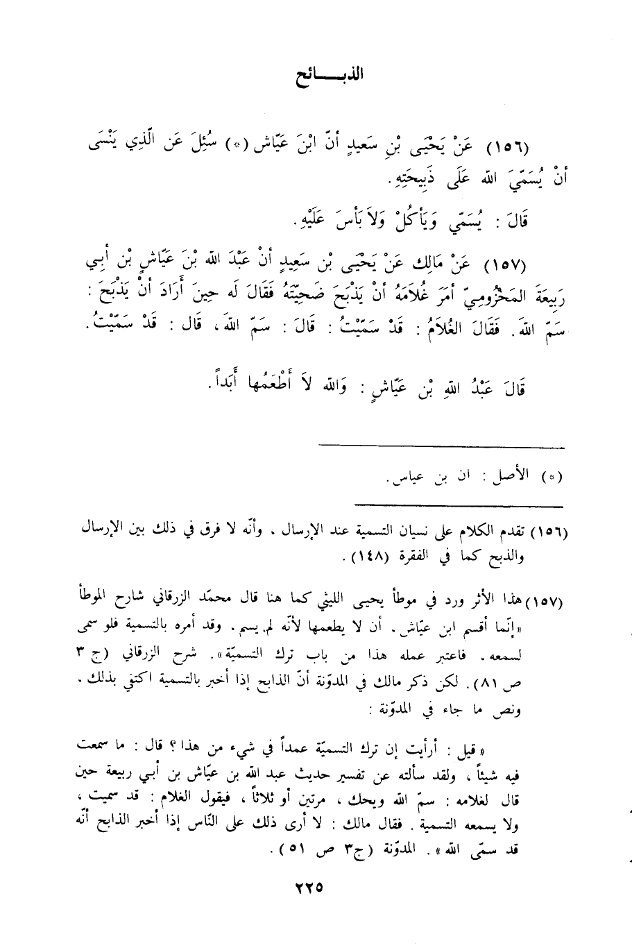 157- عن مالك عن يحيى بن سعيد أن عبد الله بن عياش بن أبي ربيعة المخزومي أمر غلامه أن يذبح ضحيته فقال له حين أراد أن يذبح: سم الله. فقال الغلام: قد سميت: قال: سم الله، قال: قد سميت.