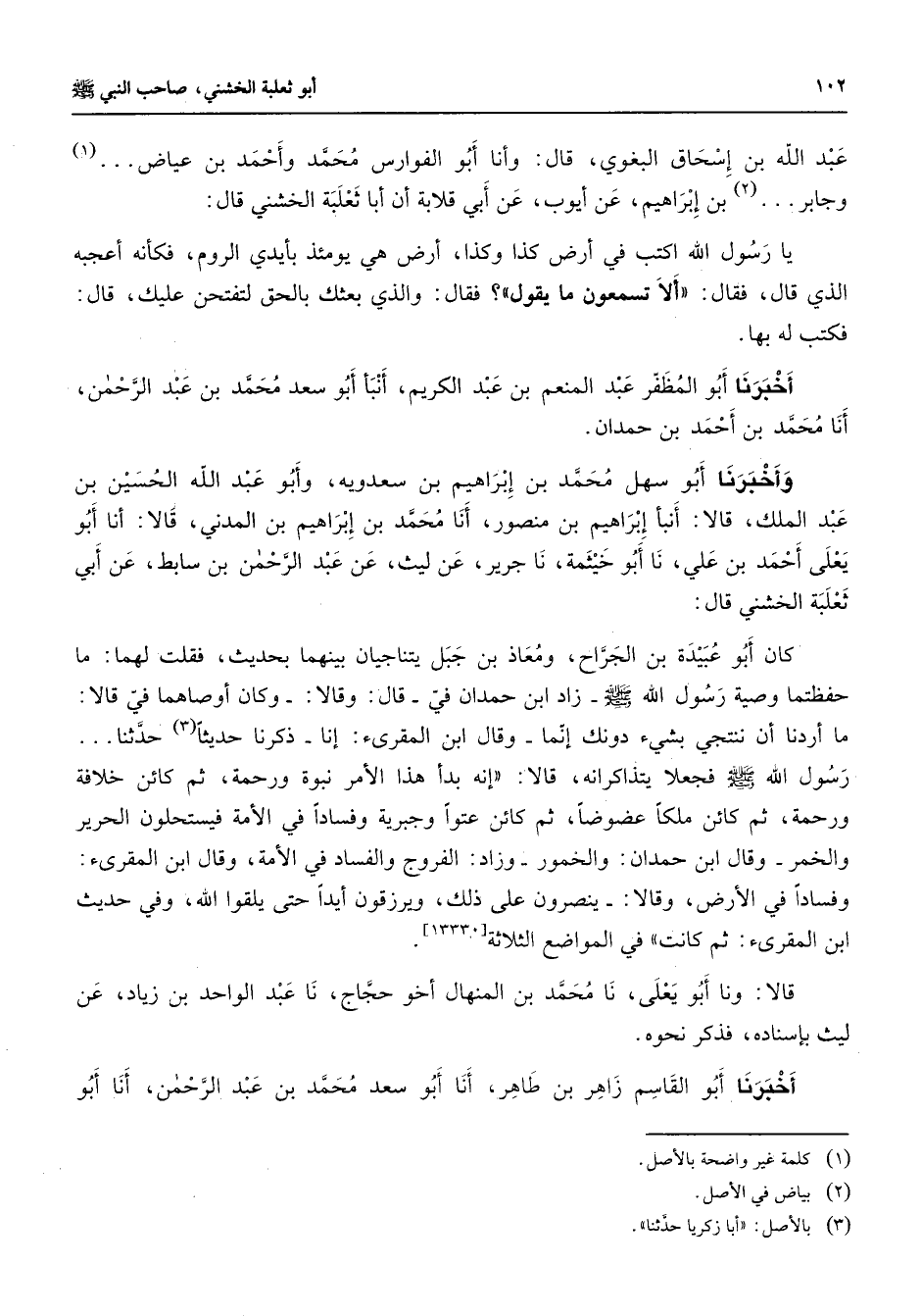عبد الله بن إسحاق البغوي قال وأنا أبو الفوارس محمد وأحمد بن عياض (1) وجابر (2) بن إبراهيم عن أيوب عن أبي قلابة أن أبي ثعلبة الخشني قال يا رسول الله أكتب في أرض كذا وكذا أرض هي يومئذ بأيدي الروم فكأنه أعجبه الذي قال فقال ألا تسمعون ما يقول فقال والذي بعثك بالحق لتفتحن عليك قال فكتب له بها أخبرنا أبو المظفر عبد المنعم بن عبد الكريم أنبأنا أبو سعد محمد بن عبد الرحمن أنا محمد بن أحمد بن حمدان وأخبرنا أبو سهل محمد بن إبراهيم بن سعدويه وأبو عبد الله الحسين بن عبد الملك قالا أنبأ إبراهيم بن منصور أنا محمد بن إبراهيم بن المدني قالا أنا أبو يعلى أحمد بن علي نا أبو خثيمة نا جرير عن ليث عن عبد الرحمن بن سابط عن أبي ثعلبة الخشني قال كان أبو عبيدة بن الجراح ومعاذ بن جبل يتناجيان بينهما بحديث فقلت لهما ما حفظتما وصية رسول الله (صلى الله عليه وسلم) زاد بن حمدان في قال وقالا وكان أوصاهما في قالا ما أردنا أن ننتجي بشئ دونك إنما وقال ابن المقرئ إنا ذكرنا حدثنا (3) حديثا رسول الله (صلى الله عليه وسلم) فجعلا يتذكرانه قالا إنه بدأ هذا الأمر نبوة ورحمة ثم كائن خلافة ورحمة ثم كائن ملكا عضوضا ثم كائن عتوا وجبرية وفسادا في الأمة فيستحلون الحرير والخمر وقال ابن حمدان والخمور وزاد الفروج والفساد في الأمة وقال ابن المقرئ وفسادا في الأرض وقالا ينصرون على ذلك ويرزقون أيدا حتى يلقوا الله وفي حديث ابن المقرئ ثم كانت في المواضع الثلاثة قالا ونا أبو يعلي نا محمد بن المنهال أخو حجاج نا عبد الواحد بن زياد عن ليث باسناده فذكر نحوه أخبرنا أبو القاسم زاهر بن طاهر أنا أبو سعد محمد بن عبد الرحمن أنا أبو