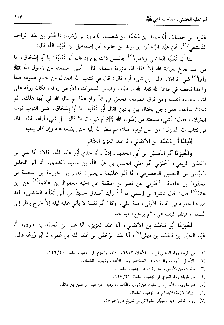 عمرو بن حمدان أنا حامد بن محمد بن شعيب نا داود بن رشيد نا عمر بن عبد الواحد الدمشقي (1) عن عبد الرحمن بن يزيد بن جابر عن إسماعيل بن عبيد الله قال بينا أبو ثعلبة الخشني وكعب (2) جالسين ذات يوم إذ قال أبو ثعلبة يا أبا إسحاق ما من عبد تفرغ لعبادة الله إلا كفاه الله مؤونة الدنيا قال أشئ سمعته من رسول الله (صلى الله عليه وسلم) أم (3) شئ تراه قال بل شئ أراه قال قال في كتاب الله المنزل من جمع همومه هما واحدا فجعله في طاعة الله كفاه الله ما همه وضمن السموات والأرض رزقه فكان رزقه على الله وعمله لنفسه ومن فرق همومه فجعل في كل واد هما لم يبال الله في أيها هلك ثم تحدثنا ساعة فمر رجل يختال بين بردين فقال أبو ثعلبة يا أبا إسحاق بئس الثوب ثوب الخيلاء فقال أشئ سمعته من رسول الله (صلى الله عليه وسلم) أم شئ تراه قال بل شئ أراه قال قال في كتاب الله المنزل من لبس ثوب خيلاء لم ينظر الله إليه حتى يضعه عنه وإن كان يحبه أنبأنا أبو محمد بن الأكفاني نا عبد العزيز الكتاني وأخبرنا أبو الحسين بن أبي الحديد إذنا أنا جدي أبو عبد الله قالا أنا علي بن الحسن الربعي أخبرني أبو علي الحسن بن عبد الله بن سعيد الكندي أنا أبو الخليل العباس بن الخليل الحضرمي نا أبو علقمة يعني نصر بن خزيمة بن علقمة بن محفوظ بن علقمة أخبرني عن نصر بن علقمة عن أخيه محفوظ بن علقمة عن (4) ابن عائذ (5) قال قال ناشرة بن سمي ما (6) رأينا أصدق حديثا من أبي ثعلبة الخشني لقد صدقنا حديثه في الفتنة الأولى فتنة علي وكان أبو ثعلبة لا يأتي عليه ليلة إلا خرج ينظر إلى السماء فينظر كيف هي ثم يرجع فيسجد أخبرنا أبو محمد بن الأكفاني أنا عبد العزيز أنا علي بن محمد بن طوق أنا عبد الجبار بن محمد بن مهنى (7) أنا عبد الرحمن بن عبد الله بن عمر نا أبو زرعة قال