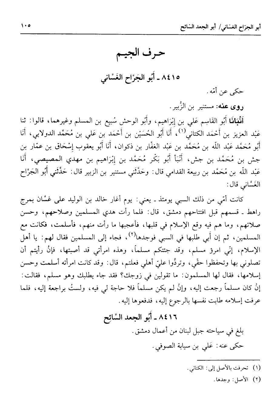 8415 - أبو الجراح الغساني حكى عن أمه روى عنه مستنير بن الزبير أنبأنا أبو القاسم علي بن إبراهيم وأبو الوحش سبيع بن المسلم وغيرهما قالوا ثنا عبد العزيز بن أحمد الكتاني (1) أنا أبو الحسين بن أحمد بن علي بن محمد الدولابي أنا أبو محمد عبد الله بن محمد بن عبد الغفار بن ذكوان أنا أبو يعقوب إسحاق بن عمار بن جش بن محمد بن جش أنبأ أبو بكر محمد بن إبراهيم بن مهدي المصيصي أنا عبد الله بن محمد بن ربيعة القدامي قال وحدثني مستنير بن الزبير قال حدثني أبو الجراح الغساني قال كانت أمي من ذلك السبي يومئذ يعني يوم أغار خالد بن الوليد على غسان بمرج راهط قسمهم قبل افتتاحهم دمشق قال فلما رأت هدي المسلمين وصلاحهم وحسن صلاتهم وما هم فيه وقع الإسلام في قلبها فأعجبها ما رأت منهم فأسلمت فكانت مع المسلمين ثم إن أبي طلبها في السبي فوجدها (2) فجاء إلى المسلمين فقال لهم يا أهل الإسلام إني امرؤ مسلم وقد جئتكم مسلما وهذه امرأتي قد أصبتها فإن رأيتم أن تصلوني بها وتحفظوا حقي وتردوا علي أهلي فعلتم قال وقد كانت امرأته أسلمت وحسن إسلامها فقال لها المسلمون ما تقولين في زوجك فقد جاء يطلبك وهو مسلم فقالت إن كان مسلما رجعت إليه وإن لم يكن مسلما فلا حاجة لي فيه ولست براجعة إليه فلما عرفت إسلامه طابت نفسها بالرجوع إليه فدفعوها إليه
