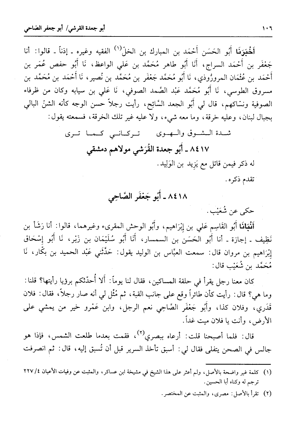 أخبرنا أبو الحسن أحمد بن المبارك بن الخل (1) الفقيه وغيره إذنا قالوا أنا جعفر بن أحمد السراج أنا أبو طاهر محمد بن علي الواعظ نا أبو حفص عمر بن أحمد بن عثمان المروروذي نا أبو محمد جعفر بن محمد بن نصير نا أحمد بن محمد بن مسروق الطوسي نا أبو محمد عبد الصمد الصوفي نا علي بن سيابه وكان من ظرفاء الصوفية ونساكهم قال لي أبو الجعد السائح رأيت رجلا حسن الوجه كأنه الشن البالي بجبال لبنان وعليه خرقة وما معه شئ ولا عليه غير تلك الخرقة فسمعته يقول * شدة الشوق والهوى * تركاني كما ترى *