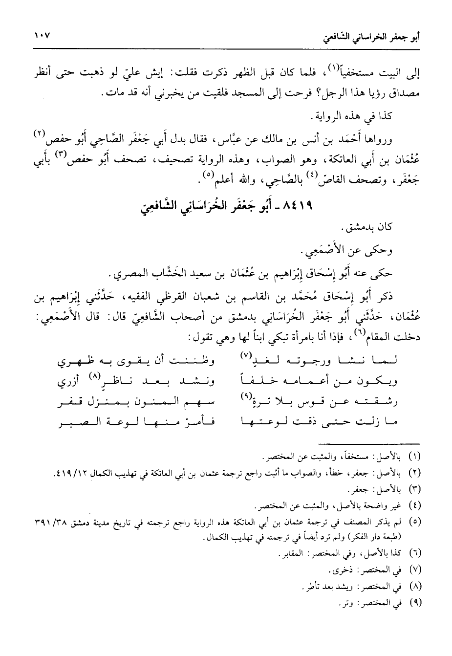 8419 - أبو جعفر الخراساني الشافعي كان بدمشق وحكى عن الأصمعي حكى عنه أبو إسحاق إبراهيم بن عثمان بن سعيد الخشاب المصري ذكر أبو إسحاق محمد بن القاسم بن شعبان القرظي الفقيه حدثني إبراهيم بن عثمان حدثني أبو جعفر الخراساني بدمشق من أصحاب الشافعي قال قال الأصمعي دخلت المقام (6) فإذا أنا بامرأة تبكي ابنا لها وهي تقول * لما نشأ ورجوته لغد (7) * وظننت أن يقوى به ظهري ويكون من أعمامه خلفا * ونشد بعد ناظر (8) أزري رشقته عن قوس بلا ترة (9) * سهم المنون بمنزل قفر ما زلت حتى ذقت لوعتها * فأمر منها لوعة الصبر *