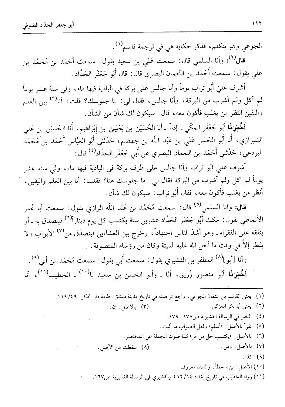 (11) رواه الخطيب في تاريخ بغداد 14 / 412 والقشيري في الرسالة القشيرية ص 167