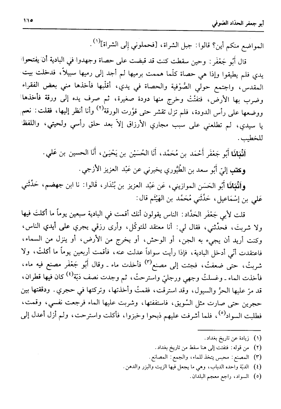 المواضع منكم أين قالوا جبل الشراة فحملوني إلى الشراة (1) قال أبو جعفر وحين سقطت كنت قد قبضت على حصاة وجهدوا في البادية أن يفتحوا يدي فلم يطيقوا وإذا هي حصاة كلما هممت برميها لم أجد إلى رميها سبيلا فدخلت بيت المقدس واجتمع حولي الصوفية والحصاة في يدي أقلبها فأخذها مني بعض الفقراء وضرب بها الأرض فتفتت وخرج منها دودة صغيرة ثم صرف يده إلى ورقة فأخذها ووضعها على رأس الدودة فلم تزل تقشر حتى قورت الورقة (2) وأنا أنظر إليها فقلت نعم يا سيدي لم تطلعني على سبب مجاري الأرزاق إلا بعد حلق رأسي ولحيتي واللفظ للخطيب أنبأنا أبو جعفر أحمد بن محمد أنا الحسين بن يحيى أنا الحسين بن علي وكتب إلي أبو سعد بن الطيوري يخبرني عن عبد العزيز الأزجي أنبأنا أبو الحسن الموازيني عن عبد العزيز بن بندار قالوا نا ابن جهضم حدثني علي بن إسماعيل حدثني محمد بن الهيثم قال قلت لأبي جعفر الحداد الناس يقولون أنك أقمت في البادية سبعين يوما ما أكلت فيها ولا شربت فحدثني فقال لي أنا معتقد للتوكل وأرى رزقي يجري بين أيدي الناس وكنت أريد أن يجئ به الجن أو الوحش أو يخرج من الأرض أو ينزل من السماء فاعتقدت أني أدخل البادية فإذا رأيت سوادا عدلت عنه فأقمت أربعين يوما ما أكلت ولا شربت حتى ضعفت فجئت إلى مصنع (3) فأخذت ماء وقال أبو جعفر مصنع فيه ماء فأخذت الماء وغسلت وجهي ورجلي واسترحت ثم وجدت نصف دبة (4) كان فيها قطران قد مر عليها الحر والسيول وقد استرقت فقمت وأخذتها وتركتها في حجري ودققتها بين حجرين حتى صارت مثل السويق فاسنفقتها وشربت عليها الماء فرجعت نفسي وقمت فطلبت السواد (5) فلما أشرفت عليهم ذبحوا وخبزوا فأكلت واسترحت فلم أزل أعدل إلى