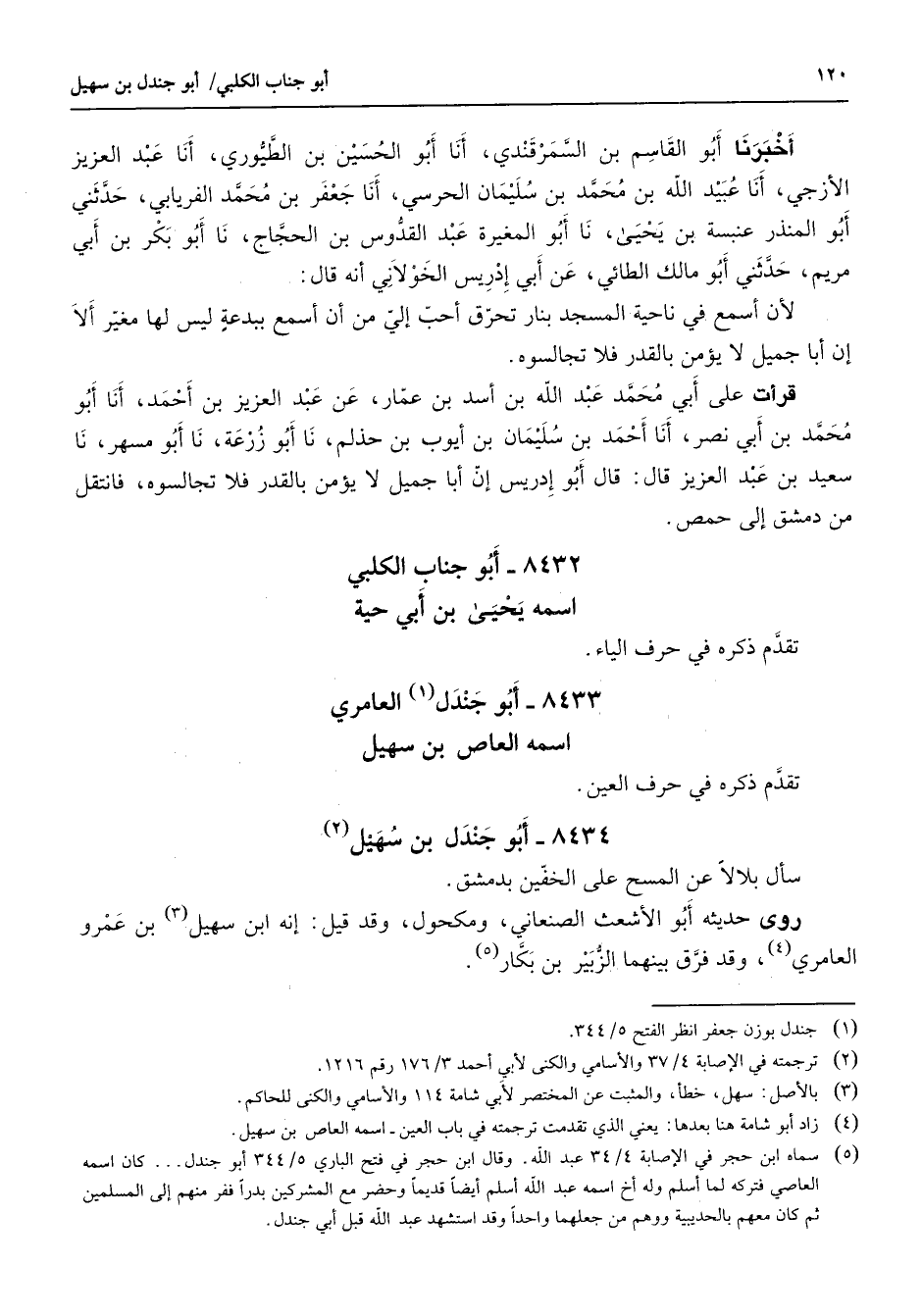 8434 - أبو جندل بن سهيل (2) سأل بلالا عن المسح على الخفين بدمشق روى حديثه أبو الأشعث الصنعاني ومكحول وقد قيل إنه ابن سهيل (3) بن عمرو العامري (4) وقد فرق بينهما الزبير بن بكار (5)
