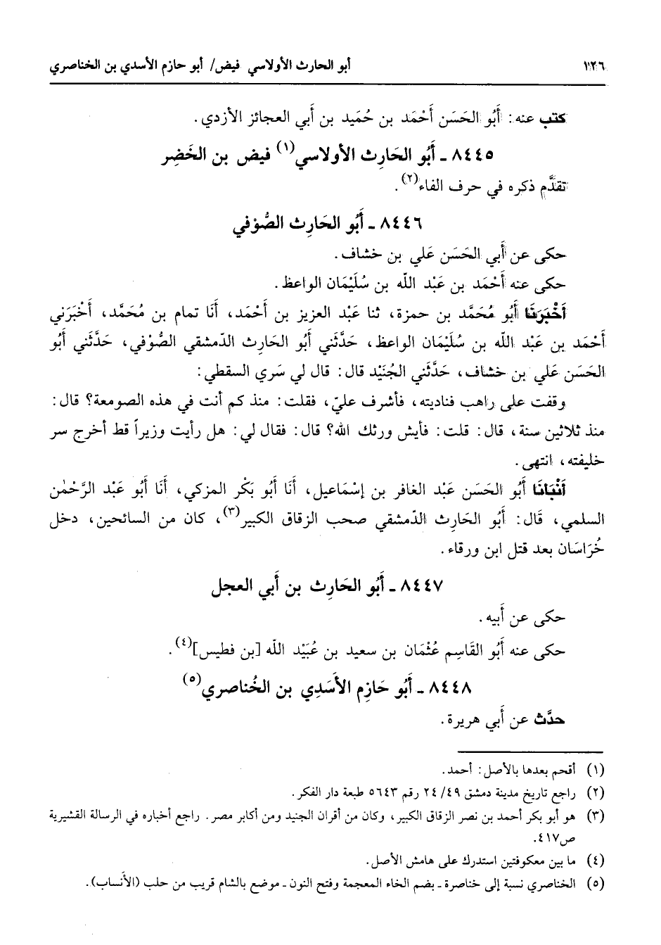 8446 - أبو الحارث الصوفي حكى عن أبى الحسن علي بن خشاف حكى عنه أحمد بن عبد الله بن سليمان الواعظ أخبرنا أبو محمد بن حمزة ثنا عبد العزيز بن أحمد أنا تمام بن محمد أخبرني أحمد بن عبد الله بن سليمان الواعظ حدثني أبو الحارث الدمشقي الصوفي حدثني أبو الحسن علي بن خشاف حدثني الجنيد قال قال لي سري السقطي وقفت على راهب فناديته فأشرف علي فقلت منذ كم أنت في هذه الصومعة قال