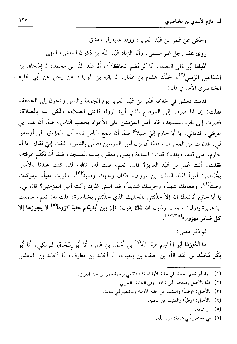 وحكى عن عمر بن عبد العزيز ووفد عليه إلى دمشق روى عنه رجل غير مسمى وأبو الزناد عبد الله بن ذكوان المدني انتهى أنبأنا أبو علي الحداد أنا أبو نعيم الحافظ (1) أنا عبد الله بن محمد نا إسحاق بن إسماعيل الرملي (2) حدثنا هشام بن عمار نا بقية بن الوليد عن رجل عن أبي حازم الخناصري الأسدي قال قدمت دمشق في خلافة عمر بن عبد العزيز يوم الجمعة والناس رائحون إلى الجمعة قلت إن أنا صرت إلى الموضع الذي أريد نزوله فاتتني الصلاة ولكن أبدأ بالصلاة فصرت إلى باب المسجد فإذا أمير المؤمنين على الأعواد يخطب الناس فلما أن بصر بي عرفني فناداني يا أبا حازم إلي مقبلا فلما أن سمع الناس نداء أمير المؤمنين لي أوسعوا لي فدنوت من المحراب فلما أن نزل أمير المؤمنين فصلى بالناس التفت إلي فقال يا أبا حازم متى قدمت بلادنا قلت الساعة وبعيري معقول بباب المسجد فلما أن تكلم عرفته فقلت أنت عمر بن عبد العزيز قال نعم قلت له تالله لقد كان عندنا بالأمس بخناصرة أمير لعبد الملك بن مروان فكان وجهك وضيئا (3) وثوبك نقيا ومركبك وطيئا (4) وطعامك شهيا وحرسك شديدا فما الذي غيرك وأنت أمير المؤمنين قال لي يا أبا حازم أناشدك الله إلا حدثتني بالحديث الذي حدثتني بخناصرة قلت له نعم سمعت أبا هريرة يقول سمعت رسول الله (صلى الله عليه وسلم) يقول إن بين أيديكم عقبة كؤودا (5) لا يجوزها إلا كل ضامر مهزول ثم ذكر معنى ما أخبرنا أبو القاسم هبة الله (6) بن أحمد بن عمر أنا أبو إسحاق البرمكي أنا أبو بكر محمد بن عبد الله بن خلف بن بخيت نا أحمد بن مطرف نا أحمد بن المغلس