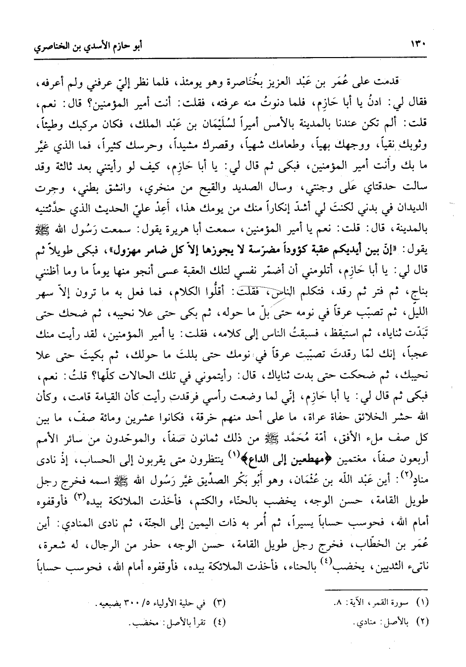 قدمت على عمر بن عبد العزيز بخناصرة وهو يومئذ فلما نظر إلى عرفني ولم أعرفه فقال لي أدن يا أبا حازم فلما دنوت منه عرفته فقلت أنت أمير المؤمنين فقال نعم قلت ألم تكن عندنا بالمدينة بالأمس أميرا لسيمان بن عبد الملك فكان مركبك وطيئا وثوبك نقيا ووجهك بهيا وطعامك شهيا وقصرك مشيدا وحرسك كثيرا فما الذي غير ما بك وأنت أمير المؤمنين فبكى ثم قال لي يا أبا حازم كيف لو رأيتني بعد ثالثة وقد سالت حدقتاي على وجنتي وسال الصديد والقيح من منخري وانشق بطني وجرت الديدان في بدني لكنت لي أشد انكارا منك من يومك هذا أعد علي الحديث الذي حدثتنيه بالمدينة قال قلت نعم يا أمير المؤمنين سمعت أبا هريرة يقول سمعت رسول الله (صلى الله عليه وسلم) يقول إن بين أيديكم عقبة كؤودا مضرسة لا يجوزها إلا كل ضامر مهزول فبكى طويلا ثم قال لي يا أبا حازم أتلومني أن أضمر نفسي لتلك العقبة عسى أنجو منها يوما ما وما أظنني بناج ثم فتر ثم رقد فتكلم الناس فقلت أقلوا الكلام فما فعل به ما ترون إلا سهر الليل ثم تصبب عرقا في نومه حتى بل ما حوله ثم بكى حتى علا نحيبه ثم ضحك حتى تبدت ثناياه ثم استيقظ فسبقت الناس إلى كلامه فقلت يا أمير المؤمنين لقد رأيت منك عجبا إنك لما رقدت تصببت عرقا في نومك حتى بللت ما حولك ثم بكيت حتى علا نحيبك ثم ضحكت حتى بدت ثناياك قال رأيتموني في تلك الحالات كلها قلت نعم فبكى ثم قال لي يا أبا حازم إني لما وضعت رأسي فرقدت رأيت كأن القيامة قامت وكأن الله حشر الخلائق حفاة عراة ما على أحد منهم خرقة فكانوا عشرين ومائة صف ما بين كل صف ملء الأفق أمة محمد (صلى الله عليه وسلم) من ذلك ثمانون والموحدون من سائر الأمم أربعون صفا مغتمين " مهطعين إلى الداع " (1) ينتظرون متى يقربون إلى الحساب إذ نادى مناد (2) أين عبد الله بن عثمان وهو أبو بكر الصديق غير رسول الله (صلى الله عليه وسلم) اسمه فخرج رجل طويل القامة حسن الوجه يخضب بالحناء والكتم فأخذت الملائكة بيده (3) فأوقفوه أمام الله فحوسب حسابا يسيرا ثم أمر به ذات اليمين إلى الجنة ثم نادى المنادي أين عمر بن الخطاب فخرج رجل طويل القامة حسن الوجه حذر من الرجال له شعرة ناتئ الثديين يخضب (4) بالحناء فأخذت الملائكة بيده فأوقفوه أمام الله فحوسب حسابا