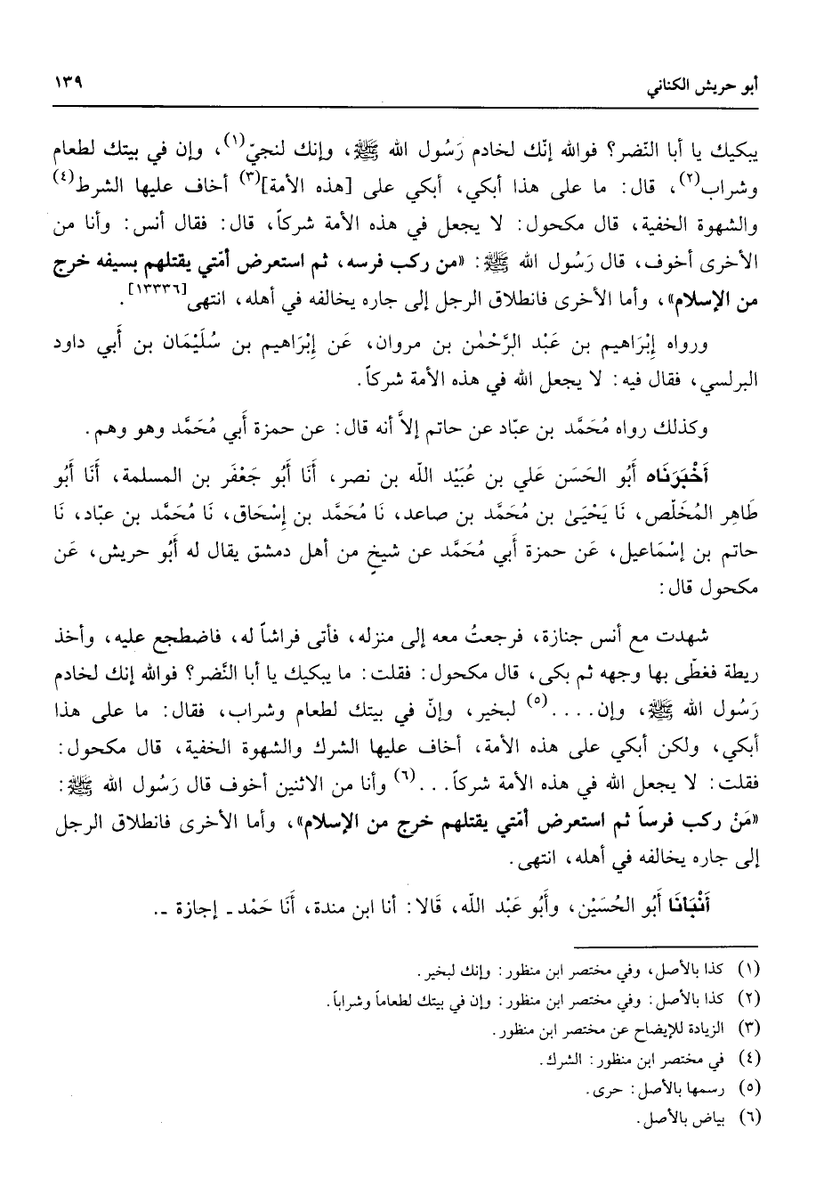 يبكيك يا أبا النضر فوالله إنك لخادم رسول الله (صلى الله عليه وسلم) وإنك لنجي (1) وإن في بيتك لطعام وشراب (2) قال ما على هذا أبكي أبكي على هذه الأمة (3) أخاف عليها الشرط (4) والشهوة الخفية قال مكحول لا يجعل في هذه الأمة شركا قال فقال أنس وأنا من الأخرى أخوف قال رسول الله (صلى الله عليه وسلم) من ركب فرسه ثم استعرض أمتي يقتلهم بسيفه خرج من الإسلام وأما الأخرى فانطلاق الرجل إلى جاره يخالفه في أهله انتهى ورواه إبراهيم بن عبد الرحمن بن مروان عن إبراهيم بن سليمان بن أبي داود البرلسي فقال فيه لا يجعل الله في هذه الأمة شركا وكذلك رواه محمد بن عباد عن حاتم إلا أنه قال عن حمزة أبي محمد وهو وهم أخبرنا أبو الحسن علي بن عبيد الله بن نصر أنا أبو جعفر بن المسلمة أنا أبو طاهر المخلص نا يحيى بن محمد بن صاعد نا محمد بن إسحاق نا محمد بن عباد نا حاتم بن إسماعيل عن حمزة أبي محمد عن شيخ من أهل دمشق يقال له أبو حريش عن مكحول قال شهدت مع أنس جنازة فرجعت معه إلى منزله فأتى فراشا له فاضطجع عليه وأخذ ريطة فغطى بها وجهه ثم بكى قال مكحول فقلت ما يبكيك يا أبا النضر فوالله إنك لخادم رسول الله (صلى الله عليه وسلم) وإن (5) لبخير وإن في بيتك لطعام وشراب فقال ما على هذا أبكي ولكن أبكي على هذه الأمة أخاف عليها الشرك والشهوة الخفية قال مكحول فقلت لا يجعل الله في هذه الأمة شركا (6) وأنا من الاثنين أخوف قال رسول الله (صلى الله عليه وسلم) من ركب فرسه ثم استعرض أمتي يقتلهم خرج من الإسلام وأما الأخرى فانطلاق الرجل إلى جاره يخالفه في أهله انتهى أنبأنا أبو الحسين وأبو عبد الله قالا أنا ابن مندة أنا حمد إجازة