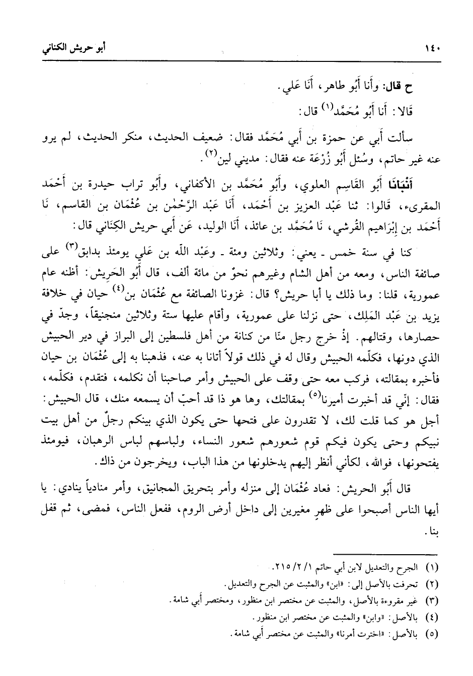 ح قال وأنا أبو طاهر أنا علي قالا أنا أبو محمد (1) قال سألت أبي عن حمزة بن أبي محمد فقال ضعيف الحديث منكر الحديث لم يرو عنه غير حاتم وسئل أبو زرعة عنه فقال مديني لين (2) أنبأنا أبو القاسم العلوي وأبو محمد بن الأكفاني وأبو تراب حيدرة بن أحمد المقرئ قالوا ثنا عبد العزيز بن أحمد أنا عبد الرحمن بن عثمان بن القاسم نا أحمد بن إبراهيم القرشي نا محمد بن عائذ أنا الوليد عن أبي حريش الكناني قال كنا في سنة خمس يعني وثلاثين ومئة وعبد الله بن علي يومئذ بدابق (3) على صائفة الناس ومعه من أهل الشام وغيرهم نحو من مائة ألف قال أبو الحريش أظنه عام عمورية قلنا وما ذلك يا أبا حريش قال غزونا الصائفة مع عثمان بن (4) حيان في خلافة يزيد بن عبد الملك حتى نزلنا على عمورية وأقام عليها ستة وثلاثين منجنيقا وجد في حصارها وقتالهم إذ خرج رجل منا من كنانة من أهل فلسطين إلى البراز في دير الحبيش الذي دونها فكلمه الحبيش وقال له في ذلك قولا أتانا به عنه فذهبنا به إلى عثمان بن حيان فأخبره بمقالته فركب معه حتى وقف على الحبيش وأمر صاحبنا أن نكلمه فتقدم فكلمه فقال إني قد أخبرت أميرنا (5) بمقالتك وها هو ذا قد أحب أن يسمعه منك قال الحبيش أجل هو كما قلت لك لا تقدرون على فتحها حتى يكون الذي بينكم رجل من أهل بيت نبيكم وحتى يكون فيكم قوم شعورهم شعور النساء ولباسهم لباس الرهبان فيومئذ يفتحونها فوالله لكأني أنظر إليهم يدخلونها من هذا الباب ويخرجون من ذاك قال أبو الحريش فعاد عثمان إلى منزله وأمر بتحريق المجانيق وأمر مناديا ينادي يا أيها الناس أصبحوا على ظهر مغيرين إلى داخل أرض الروم ففعل الناس فمضى ثم قفل بنا