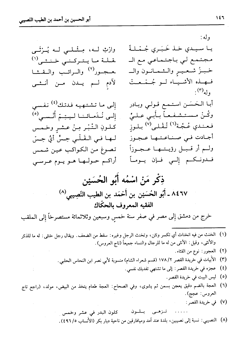وله * يا سيدي خذ خبري جملة * وارث له مثلي له يرثى مجتمع لي باجتماعي مع ال * قلة ما يتركني خنثى (1) خبز شعير والثمانون وال * عجوز (2) والرائب والقثا فهذه الأشياء لو جمعت * لآدم لم يدن من أنثى * وله (3) * أبا الحسن استمع قولي وبادر * إلى ما تشتهيه فدتك (4) نفسي وكن مستشفعا بأبي علي * إلى ندمائنا ليتم أنسي (5) فعندي عجة (6) تقلى (7) بلوز * كلون التبر من عشر وخمس أجادت في صناعتها عجوز * ها هي القلي حس أي حس ولم أر قبل رؤيتها عجوزا * تصوغ من الكواكب عين شمس فدونكم إلي فإن يوما * أراكم حولها هو يوم عرسي * " ذكر من اسمه أبو الحسين "