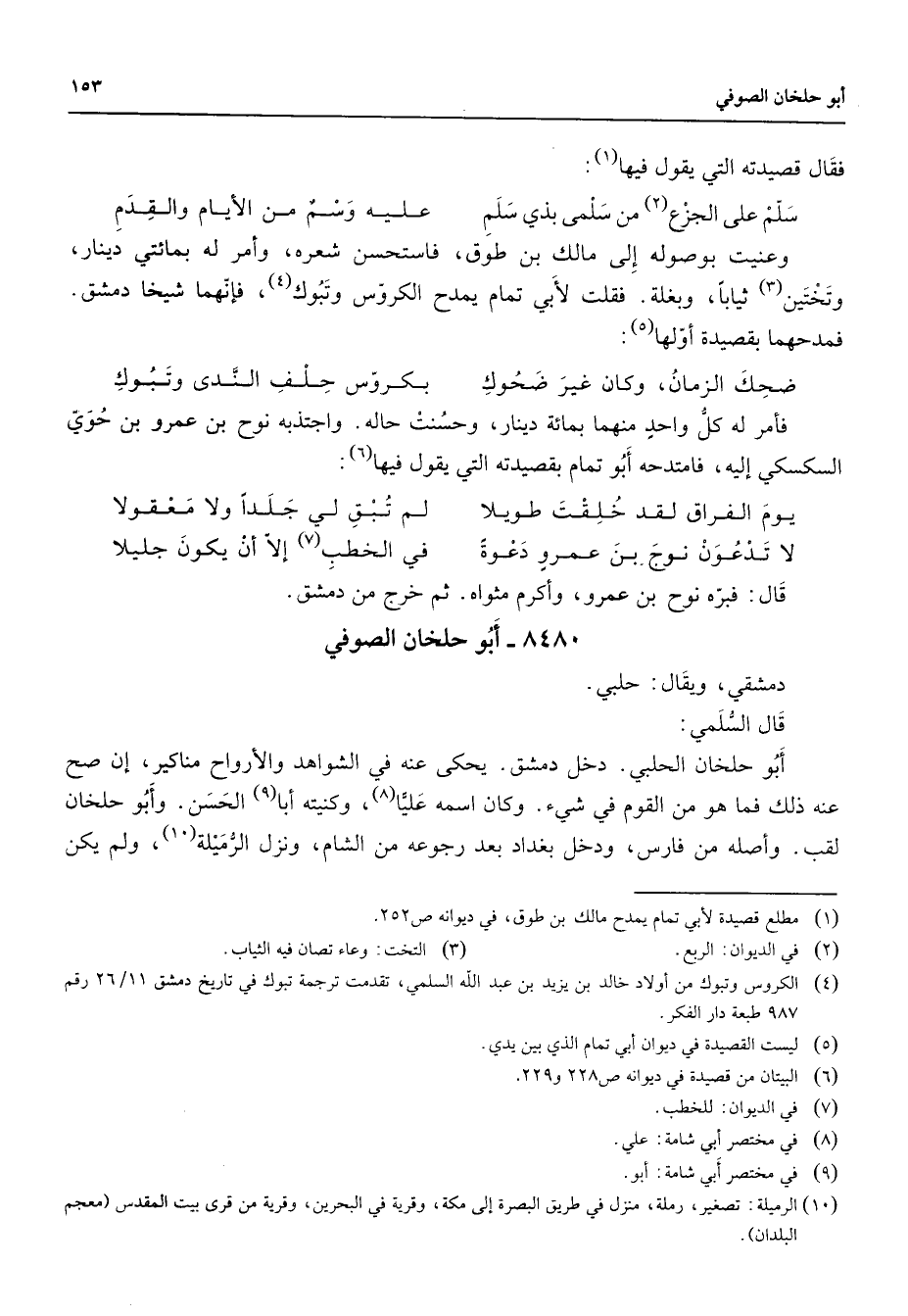 8480 - أبو حلخان الصوفي دمشقي ويقال حلبي قال السلمي أبو حلخان الحلبي دخل دمشق يحكى عنه في الشواهد والأرواح مناكير إن صح عنه ذلك فما هو من القوم في شئ وكان اسمه عليا (8) وكنيته أبا (9) الحسن وأبو حلخان لقب وأصله من فارس ودخل بغداد بعد رجوعه من الشام ونزل الرميلة (10) ولم يكن