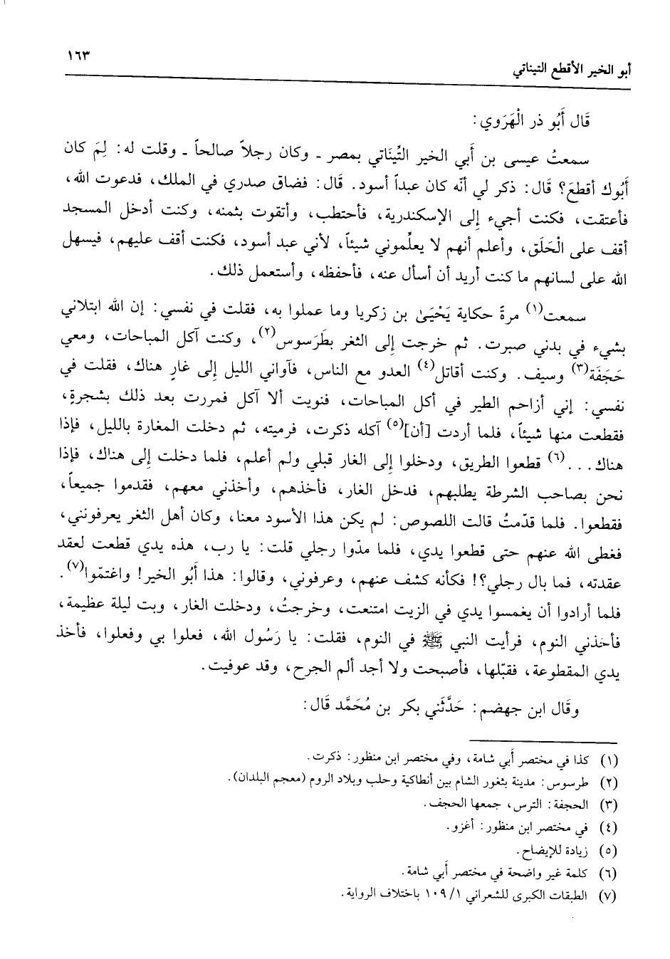 قال أبو ذر الهروي سمعت عيسى بن أبي الخير التيناتي بمصر وكان رجلا صالحا وقلت له لم كان أبوك أقطع قال ذكر لي أنه كان عبدا أسود قال فضاق صدري في الملك فدعوت الله فأعتقت فكنت أجئ إلى الإسكندرية فأحتطب وأتقوت بثمنه وكنت أدخل المسجد أقف على الحلق وأعلم أنهم لا يعلموني شيئا لأني عبد أسود فكنت أقف عليهم فيسهل الله على لسانهم ما كنت أريد أن أسأل عنه فأحفظه وأستعمل ذلك سمعت (1) مرة حكاية يحيى بن زكريا وما عملوا به فقلت في نفسي إن الله ابتلاني بشئ في بدني صبرت ثم خرجت إلى الثغر بطرطوس (2) وكنت آكل المباحات ومعي حجفة (3) وسيف وكنت أقاتل (4) العدو مع الناس فآواني الليل إلى غار هناك فقلت في نفسي إني أزاحم الطير في أكل المباحات فنويت ألا آكل فمررت بعد ذلك بشجرة فقطعت منها شيئا فلما أردت أن (5) آكله ذكرت فرميته ثم دخلت المغارة بالليل فإذا هناك (6) قطعوا الطريق ودخلوا إلى الغار قبلي ولم أعلم فلما دخلت إلى هناك فإذا نحن بصاحب الشرطة يطلبهم فدخل الغار فأخذهم وأخذني معهم فقدموا جميعا فقطعوا فلما قدمت قالت اللصوص لم يكن هذا الأسود معنا وكان أهل الثغر يعرفونني فغطى الله عنهم حتى قطعوا يدي فلما مدوا رجلي قلت يا رب هذه يدي قطعت لعقد عقدته فما بال رجلي فكأنه كشف عنهم وعرفوني وقالوا هذا أبو الخير واغتموا (7) فلما أرادوا أن يغمسوا يدي في الزيت امتنعت وخرجت ودخلت الغار وبت ليلة عظيمة فأخذني النوم فرأيت النبي (صلى الله عليه وسلم) في النوم فقلت يا رسول الله فعلوا بي وفعلوا فأخذ يدي المقطوعة فقبلها فأصبحت ولا أجد ألم الجرح وقد عوفيت قال أبو جهضم حدثتي أبو بكر بن محمد قال