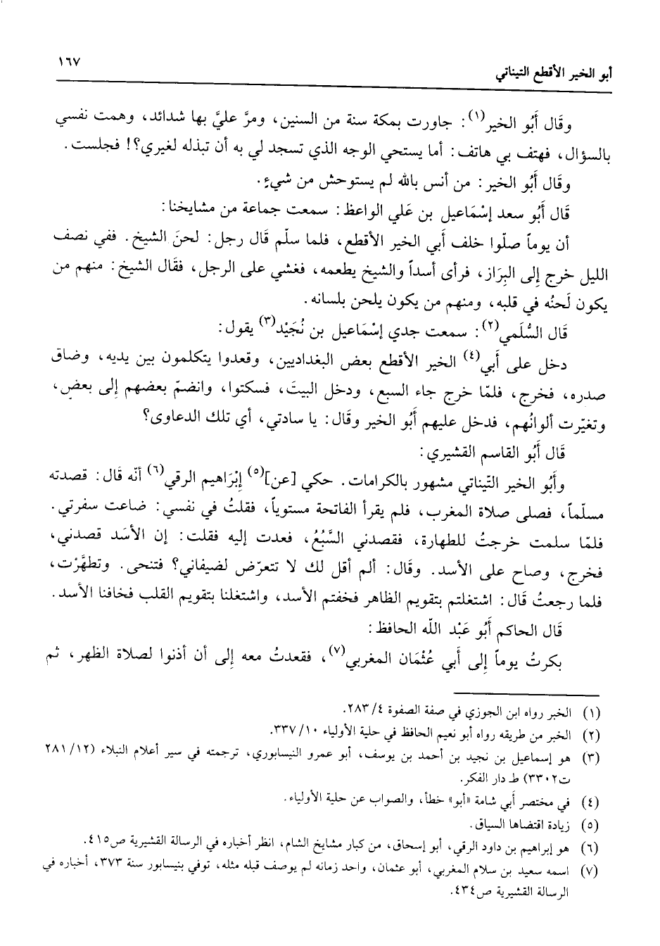 (7) اسمه سعيد بن سلام المغربي أبو عثمان واحد زمانه لم يوصف قبله مثله توفي بنيسابور سنة 373، أخباره في الرسالة القشيرية ص 434