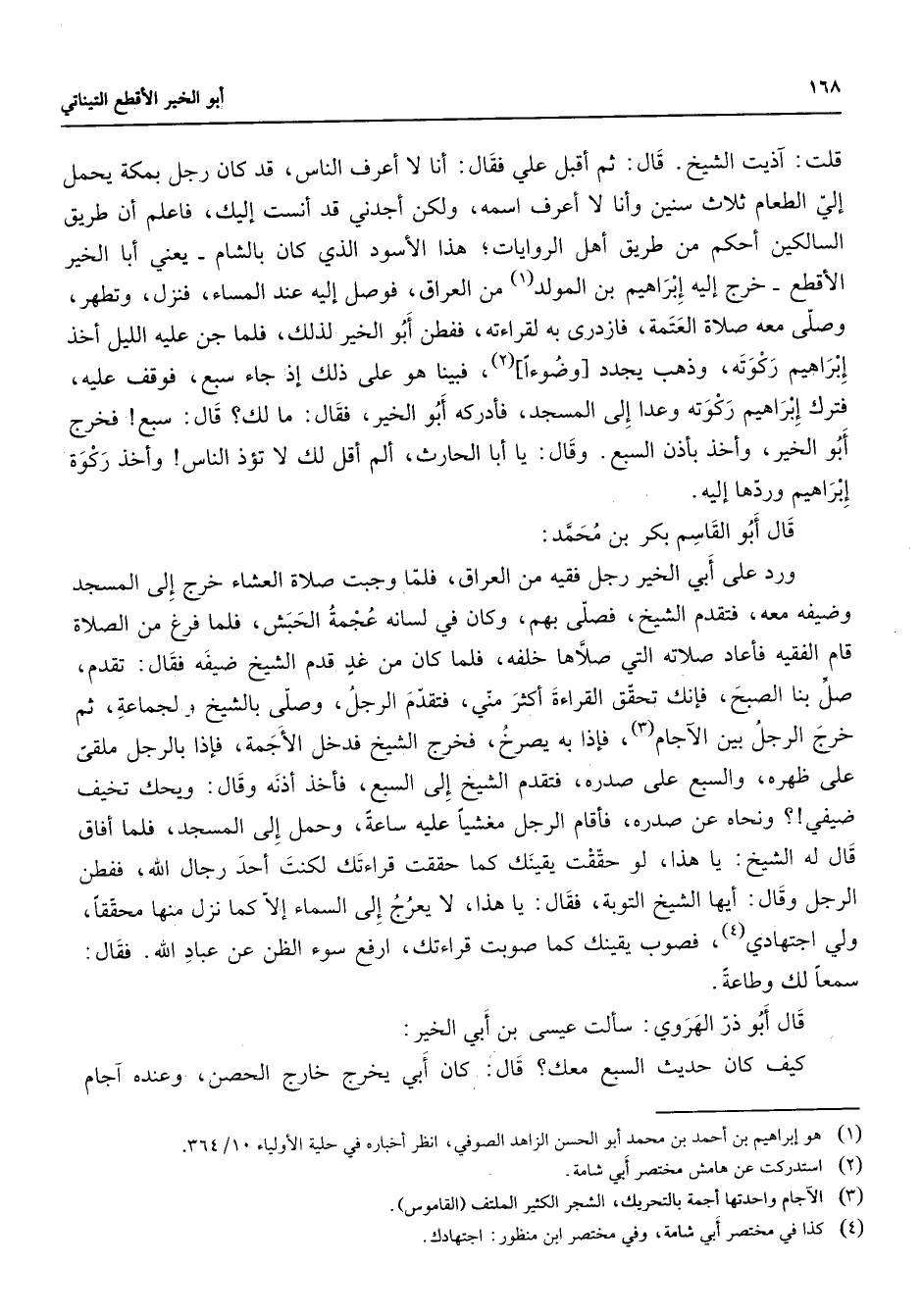 قلت آذيت الشيخ قال ثم أقبل علي فقال أنا لا أعرف الناس قد كان رجل بمكة يحمل إلي الطعام ثلاث سنين وأنا لا أعرف اسمه ولكن أجدني قد أنست إليك فاعلم أن طريق السالكين أحكم من طريق أهل الروايات هذا الأسود الذي كان بالشام يعني أبا الخير الأقطع خرج إليه إبراهيم بن المولد (1) من العراق فوصل إليه عند المساء فنزل وتطهر وصلى معه صلاة العتمة فازدرى به لقراءته ففطن أبو الخير لذلك فلما جن عليه الليل أخذ إبراهيم ركوته وذهب يجدد وضوءا (2) فبينا هو على ذلك إذ جاء سبع فوقف عليه فترك إبراهيم ركوته وعدا إلى المسجد فأدركه أبو الخير فقال ما لك قال سبع فخرج أبو الخير وأخذ بأذن السبع وقال با أبا الحارث ألم أقل لك لا تؤذ الناس وأخذ ركوة إبراهيم وردها إليه قال أبو القاسم بكر بن محمد ورد على أبي الخير رجل فقيه من العراق فلما وجبت صلاة العشاء خرج إلى المسجد وضيفه معه فتقدم الشيخ فصلى بهم وكان في لسانه عجمة الحبش فلما فرغ من الصلاة قام الفقيه فأعاد الصلاة التي صلاها خلفه فلما كان من غد قدم الشيخ ضيفه فقال تقدم صل بنا الصبح فإنك تحقق القراءة أكثر مني فتقدم الرجل وصلى بالشيخ ولجماعة ثم خرج الرجل بين الآجام (3) فإذا به يصرخ فخرج الشيخ فدخل الأجمة فإذا بالرجل ملقى على ظهره والسبع على صدره فتقدم الشيخ إلى السبع فأخذ أذنه وقال ويحك تخيف ضيفي ونحاه عن صدره فأقام الرجل مغشيا عليه ساعة وحمل إلى المسجد فلما أفاق قال له الشيخ يا هذا لو حققت يقينك كما حققت قراءتك لكنت أحد رجال الله ففطن الرجل وقال أيها الشيخ التوبة فقال يا هذا لا يعرج إلى السماء إلا كما نزل منها محققا ولي اجتهادي (4) فصوب يقينك كما صوبت قراءتك ارفع سوء الظن عن عباد الله فقال سمعا لك وطاعة قال أبو ذر الهروي سألت عيسى بن أبي الخير كيف كان حديث السبع معك قال كان أبي يخرج خارج الحصن وعنده آجام