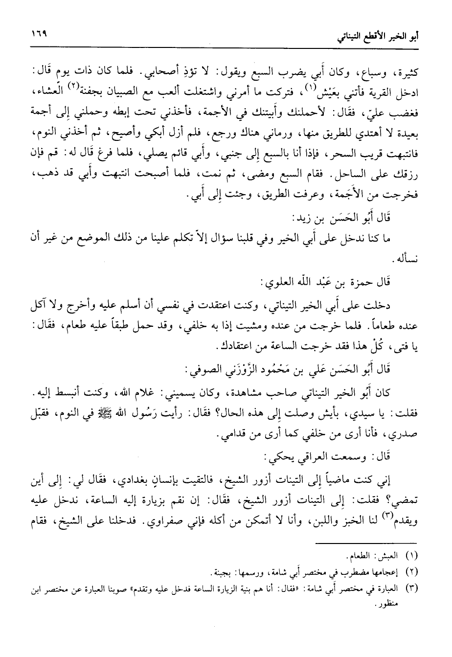 كثيرة وسباع وكان أبي يضرب السبع ويقول لا تؤذ أصحابي فلما كان ذات يوم قال ادخل القرية فأتني بعيش (1) فتركت ما أمرني واشتغلت ألعب مع الصبيان بجفنة (2) العشاء فغضب علي فقال لأحملنك وأبيتنك في الأجمة فأخذني تحت ابطه وحملني إلى أجمة بعيدة لا أهتدي للطريق منها ورماني هناك ورجع فلم أزل أبكي وأصيح ثم أخذني النوم فانتبهت قريب السحر فإذا أنا بالسبع إلى جنبي وأبي قائم يصلي فلما فرغ قال له قم فإن رزقك على الساحل فقام السبع ومضى ثم نمت فلما أصبحت انتهيت وأبي قد ذهب فخرجت من الأجمة وعرفت الطريق وجئت إلى أبي قال أبو الحسن بن زيد ما كنا ندخل على أبي الخير وفي قلبنا سؤال إلا تكلم علينا من ذلك الموضع من غير أن نسأله قال حمزة بن عبد الله العلوي دخلت على أبي الخير التيناتي وكنت اعتقدت في نفسي أن أسلم عليه وأخرج ولا آكل عنده طعاما فلما خرجت من عنده ومشيت إذا به خلفي وقد حمل طبقا عليه طعام فقال يا فتى كل هذا فقد خرجت الساعة من اعتقادك قال أبو الحسن علي بن محمود الزوزني الصوفي كان أبو الخير التيناتي صاحب مشاهدة وكان يسميني غلام الله وكنت أنبسط إليه فقلت يا سيدي بأيش وصلت إلى هذا الحال فقال رأيت رسول الله (صلى الله عليه وسلم) في النوم فقبل صدري فأنا أرى من خلفي كما أرى من قدامي قال وسمعت العراقي يحكي إني كنت ماضيا إلى التينات أزور الشيخ فالتقيت بإنسان بغدادي فقال لي إلى أين تمضي فقلت إلى التينات أزور الشيخ فقال إن نقم بزيارة إليه الساعة ندخل عليه ويقدم (3) لنا الخبز واللبن وأنا لا أتمكن من أكله فإني صفراوي فدخلنا على الشيخ فقام