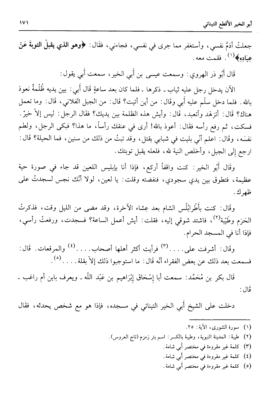 جعلت أذم نفسي وأستغفر مما جرى في نفسي فجاءني فقال " وهو الذي يقبل التوبة عن عباده " (1) فقمت معه قال أبو ذر الهروي وسمعت عيسى بن أبي الخير سمعت أبي يقول الآن يدخل رجل عليه ثياب ذكرها فلما كان بعد ساعة قال أبي بين يديه ظلمة نعوذ بالله فلما ذخل سلم عليه أبي وقال من أين أتيت قال من الجبل الفلاني قال وما تعمل هناك قال أتزهد وأتعبد قال وأيش هذه الظلمة بين يديك فقال الرجل ليس إلا خير فسكت ثم رفع رأسه فقال أعوذ بالله أرى في عنقك رأسا ما هذا فبكى الرجل ولطم نفسه وقال أعلم أني بليت في شبابي بقتل وقد تبت من ذلك من سنين فما الحيلة قال ارجع إلى الجبل وأخلص النية لله فلعله يقبل توبتك وقال أبو الخير كنت واقفا أركع فإذا أنا بإبليس اللعين قد جاء في صورة حية عظيمة فتطوق بين يدي سجودي فنفضته وقلت يا لعين لولا أنك نجس لسجدت على ظهرك وقال كنت بأطرابلس الشام بعد عشاء الآخرة وقد مضى من الليل وقت فذكرت الحرم وطيبة (2) فاشتد شوقي إليه فقلت أيش أعمل الساعة فسجدت ورفعت رأسي فإذا أنا في المسجد الحرام وقال أشرفت على (3) فرأيت أكثر أهلها أصحاب (4) والمرقعات قال فسمعت بعد ذلك عن بعض الفقراء أنه قال ما استوجبوا ذلك إلا بقلة (5) قال أبو بكر بن محمد سمعت أبا إسحاق إبراهيم بن عبد الله ويعرف بابن أم راغب قال دخلت على الشيخ أبي الخير التيناتي في مسجده فإذا هو مع شخص يحدثه فقال