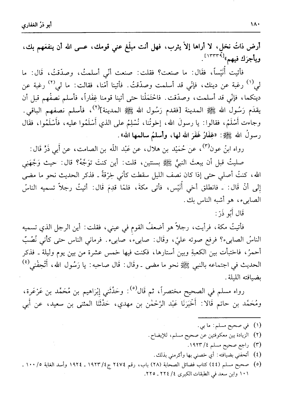 أرض ذات نخل لا أراها إلا يثرب فهل أنت مبلغ عني قومك عسى الله أن ينفعهم بك ويأجرك فيهم فأتيت أنيسا فقال ما صنعت فقلت صنعت أني أسلمت وصدقت قال ما لي (1) رغبة عن دينك فإني قد أسلمت وصدقت فأتينا أمنا فقالت لي (2) رغبة عن دينكما فإني قد أسلمت وصدقت فاحتملنا حتى أتينا قومنا غفارا فأسلم نصفهم قبل أن يقدم رسول الله (صلى الله عليه وسلم) المدينة فقدم رسول الله (صلى الله عليه وسلم) المدينة فأسلم (2) نصفهم الباقي وجاءت أسلم فقالوا يا رسول الله إخوتنا نسلم على الذي أسلموا عليه فأسلموا فقال رسول الله (صلى الله عليه وسلم) غفارا غفر الله لها وأسلم سالمها الله رواه ابن عون (3) عن حميد بن هلال عن عبد الله بن الصامت عن أبي ذر قال صليت قبل أن يبعث النبي (صلى الله عليه وسلم) بسنتين قلت أين كنت توجه قال حيث وجهني الله كنت أصلي حتى إذا كان نصف الليل سقطت كأني خرقة فذكر الحديث نحو ما مضى إلى أن قال فانطلق أخي أنيس فأتى مكة فلما قدم قال أتيت رجلا تسميه الناس الصابئ هو أشبه الناس بك قال أبو ذر فأتيت مكة فرأيت رجلا هو أضعف القوم في عيني فقلت أين الرجل الذي يسميه الناس الصابئ فرفع صوته علي وقال صابئ صابئ فرماني الناس حتى كأني نصب أحمر فاختبأت بين الكعبة وبين أستارها فكنت فيها خمس عشرة من بين يوم وليلة فذكر الحديث في اجتماعه بالنبي (صلى الله عليه وسلم) نحو ما مضى وقال قال صاحبه يا رسول الله أتحفني (4) بضيافته الليلة رواه مسلم في الصحيح مختصرا ثم قال (5) وحدثني إبراهيم بن محمد بن عرعرة ومحمد بن حاتم قالا أخبرنا عبد الرحمن بن مهدي حدثنا المثنى بن سعيد عن أبي