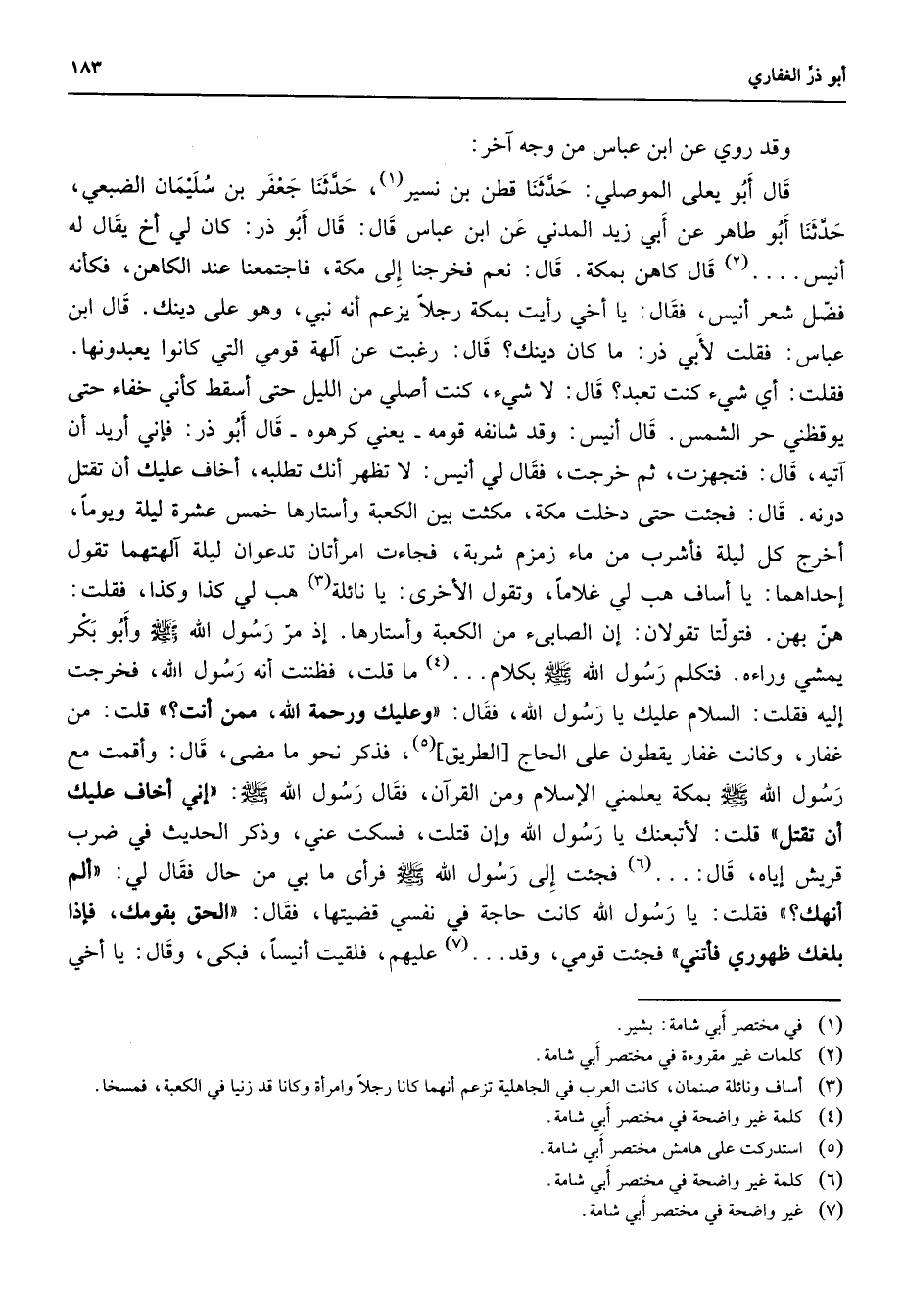 وقد روي عن ابن عباس من وجه آخر قال أبو يعلى الموصلي حدثنا قطن بن نسير (1) حدثنا جعفر بن سليمان الضبعي حدثنا أبو طاهر علي بن زيد المدني عن ابن عباس قال قال أبو ذر كان لي أخ يقال له أنيس (2) قال كاهن بمكة قال نعم فخرجنا إلى مكة فاجتمعنا عند الكاهن فكأنه فضل شعر أنيس فقال يا أخي رأيت بمكة رجل يزعم أنه نبي وهو على دينك قال ابن عباس قلت لأبي ذر ما كان دينك قال رغبت عن آلهة قومي التي كانوا يعبدونها فقلت أي شئ كنت تعبد قال لا شئ كنت أصلي من الليل حتى أسقط كأني خفاء حتى يوقظني حر الشمس قال أنيس وقد شانفه قومه يعني كرهوه قال أبو ذر فإني أريد أن آتيه قال فتجهزت ثم خرجت فقال لي أنيس لا تظهر أنك تطلبه أخاف عليك أن تقتل دونه قال فجئت حتى دخلت مكة مكثت بين الكعبة وأستارها خمسة عشرة ليلة ويوما أخرج كل ليلة فأشرب من ماء زمزم شربة فجاءت امرأتان تدعوان ليلة آلهتهما تقول إحداهما يا أساف هب لي غلام وتقول الأخرى يا نائلة (3) هب لي كذا وكذا فقلت هن بهن فتولتا تقولان إن الصابئ من الكعبة وأستارها إذ مر رسول الله (صلى الله عليه وسلم) وأبو بكر يمشي وراءه فتكلم رسول الله (صلى الله عليه وسلم) بكلام (4) ما قلت فظننت أنه رسول الله فخرجت إليه فقلت السلام عليك يا رسول الله فقال وعليك رحمة الله ممن أنت قلت من غفار وكانت غفار يقطون على الحاج الطريق (5) فذكر نحو ما مضى قال وأقمت مع رسول الله (صلى الله عليه وسلم) بمكة يعلمني الإسلام ومن القرآن فقال رسول الله (صلى الله عليه وسلم) إني أخاف عليك أن تقتل قلت لأتبعنك يا رسول الله وإن قتلت فسكت عني وذكر الحديث في ضرب قريش إياه قال (6) فجئت إلى رسول الله (صلى الله عليه وسلم) فرأى ما بي من حال فقال لي ألم أنهك فقلت يا رسول الله كانت حاجة في نفسي قضيتها فقال الحق بقومك فإذا بلغك ظهوري فأتني فجئت قومي وقد (7) عليهم فلقيت أنيسا فبكى وقال يا أخي