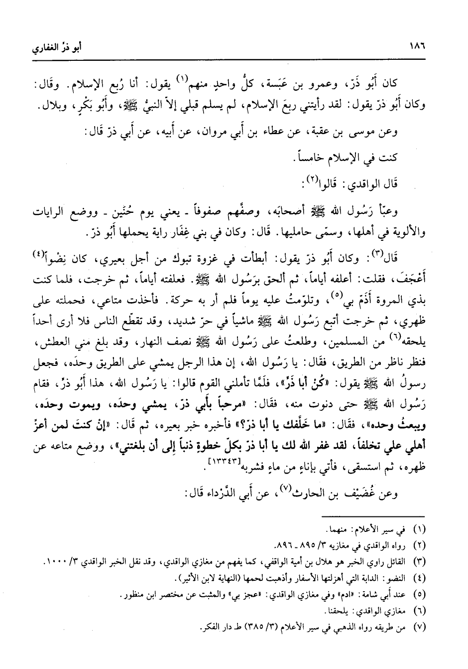 كان أبو ذر وعمرو بن عبسة كل واحد منهم (1) يقول أنا ربع الإسلام وقال وكان أبو ذر يقول لقد رأيتني ربع الإسلام لم يسلم قبلي إلا النبي (صلى الله عليه وسلم) وأبو بكر وبلال وعن موسى بن عقبة عن عطاء بن أبي مروان عن أبيه عن أبي ذر قال كنت في الإسلام خامسا قال الواقدي قالوا (2) وعبأ رسول الله (صلى الله عليه وسلم) أصحابه وصفهم صفوفا يعني يوم حنين ووضع الرايات والألوية في أهلها وسمى حامليها قال وكان في بني غفار راية يحملها أبو ذر قال (3) وكان أبو ذر يقول أبطأت في غزوة تبوك من أجل بعيري كان نضوا (4) أعجف فقلت أعلفه أياما ثم ألحق برسول الله (صلى الله عليه وسلم) فعلفته أياما ثم خرجت فلما كنت بذي المروة أذم بي (5) وتلومت عليه يوما فلم أر به حركة فأخذت متاعي فحملته على ظهري ثم خرجت أتبع رسول الله (صلى الله عليه وسلم) ماشيا في حر شديد وقد تقطع الناس فلا أرى أحدا يلحقه (6) من المسلمين وطلعت على رسول الله (صلى الله عليه وسلم) نصف النهار وقد بلغ مني العطش فنظر ناظر من الطريق فقال يا رسول الله هذا الرجل يمشي على الطريق وحده فجعل رسول الله (صلى الله عليه وسلم) يقول كن أبا ذر فلما تأملني القوم قالوا يا رسول الله هذا أبو ذر فقام رسول الله (صلى الله عليه وسلم) حتى دنوت منه فقال مرحبا بأبي ذر يمشي وحده ويموت وحده ويبعث وحده فقال ما خلفك يا أبا ذر فأخبره خبر بعيره ثم قال إن كنت لمن أعز أهلي علي تخلفا لقد غفر الله لك يا أبا ذر بكل خطوة ذنبا إلى أن بلغتني ووضع متاعه عن ظهره ثم استسقى فأتى بإناء من ماء فشربه وعن عضيف بن الحارث (7) عن أبي الدرداء قال