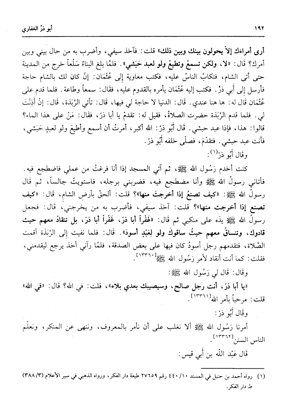 أرى أمراءك إلا يحولون بينك وبين ذلك فآخذ سيفي وأضرب به من حال بيني وبين أمرك قال لا ولكن تسمع وتطيع ولو لعبد حبشي فلما بلغ البناء سلعا خرج من المدينة حتى أتى الشام فتكاب الناس عليه فكتب معاوية إلى عثمان إن كان لك بالشام حاجة فأرسل إلى أبي ذر فكتب إليه عثمان يأمره بالقدوم عليه فقال سمعا وطاعة فلما قدم على عثمان قال له ها هنا عندي قال الدنيا لا حاجة لي فيها قال تأتي الربذة قال إن أذنت لي فلما قدم الربذة حضرت الصلاة فقيل له تقدم يا أبا ذر فقال من على هذا الماء قالوا هذا فإذا عبد حبشي قال أبو ذر الله أكبر أمرت أن أسمع وأطيع ولو لعبد حبشي فأنت عبد حبشي فتقدم فصلى خلفه أبو ذر وقال أبو ذر (1) كنت أخدم رسول الله (صلى الله عليه وسلم) ثم آتي المسجد إذا أنا فرغت من عملي فاضطجع فيه فأتاني رسول الله (صلى الله عليه وسلم) وأنا مضطجع فيه فضربني برجله فاستويت جالسا ثم قال رسول الله (صلى الله عليه وسلم) كيف تصنع إذا أخرجت منها قلت ألحق بأرض الشام قال كيف تصنع إذا أخرجت منها قلت آخذ سيفي فأضرب به من يخرجني قال فجعل رسول الله (صلى الله عليه وسلم) يده على منكبي ثم قال غفرا أبا ذر غفرا أبا ذر بل تنقاد معهم حيث قادوك وتنساق معهم حيث ساقوك ولو لعبد أسود قال فلما نفيت إلى الربذة أقمت الصلاة فتقدمهم رجل أسود كان فيها على بعض الصدقة فلما رآني أخذ يرجع ليقدمني فقلت كما أنت لأمر رسول الله صلى الله عليه وسلم وقال قال لي رسول الله (صلى الله عليه وسلم) يا أبا ذر أنت رجل صالح وسيصيبك بعدي بلاء قلت في الله قال في الله قلت مرحبا بأمر الله وقال أبو ذر أمرنا رسول الله (صلى الله عليه وسلم) ألا نغلب على أن نأمر بالمعروف وننهى عن المنكر ونعلم الناس السنن قال عبد الله بن أبي قيس