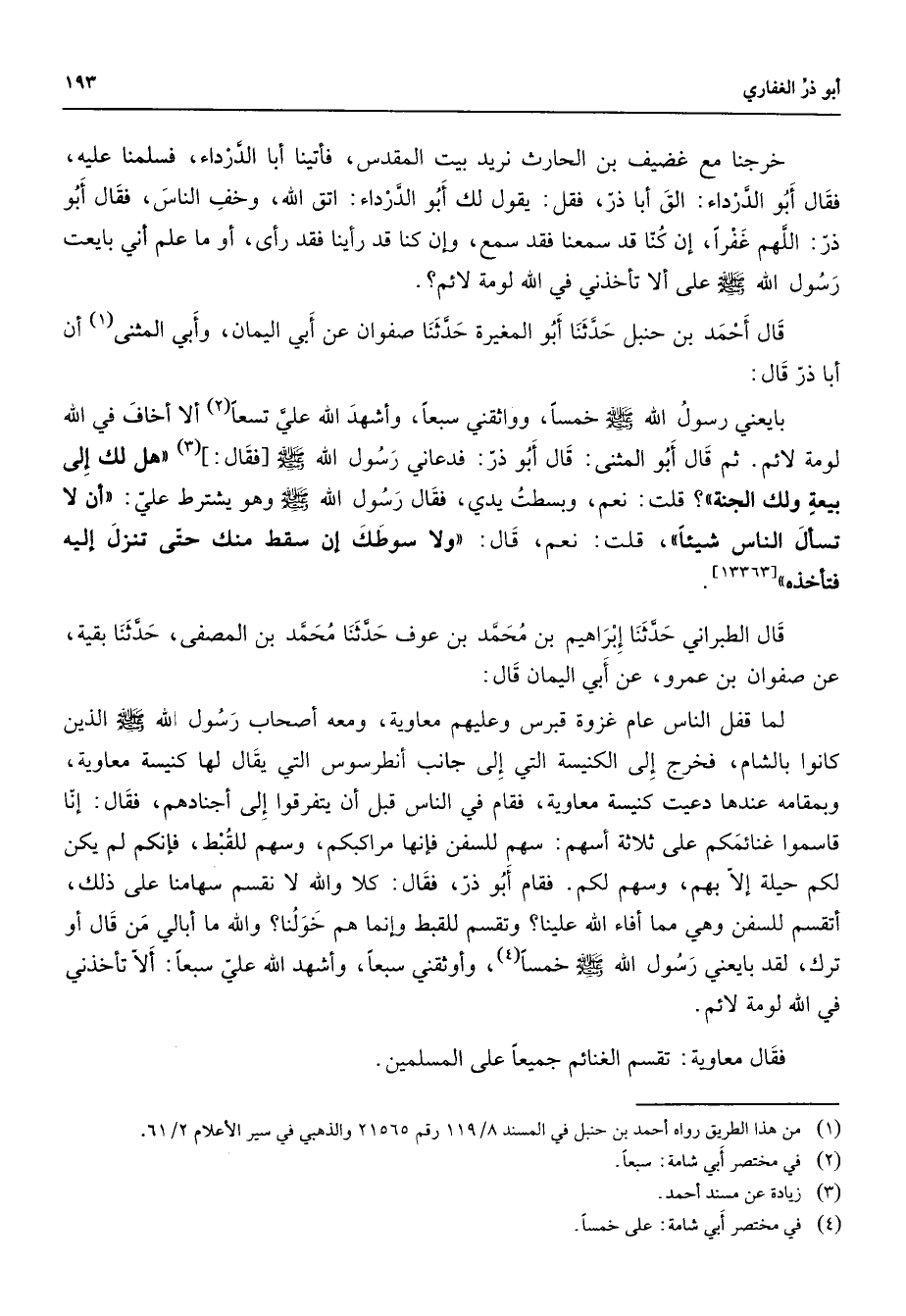 خرجنا مع غضيف بن الحارث نريد بيت المقدس فأتينا أبا الدرداء فسلمنا عليه فقال أبو الدرداء الق أبا ذر فقل يقول لك أبو الدرداء اتق الله وخف الناس فقال أبو ذر اللهم غفرا إن كنا قد سمعنا فقد سمع وإن كنا قد رأينا فقد رأى أو ما علم أني بايعت رسول الله (صلى الله عليه وسلم) على ألا تأخذني في الله لومة لائم قال أحمد بن حنبل حدثنا أبو المغيرة حدثنا صفوان عن أبي اليمان وأبي المثنى (1) أن أبا ذر قال بايعني رسول الله خمسا وواثقني سبعا وأشهد الله علي تسعا (2) ألا أخاف في الله لومة لائم ثم قال أبو المثنى قال أبو ذر فدعاني رسول الله (صلى الله عليه وسلم) فقال (3) هل لك إلى بيعة ولك الجنة قلت نعم وبسطت يدي فقال رسول الله (صلى الله عليه وسلم) وهو يشترط علي أن لا تسأل الناس شيئا قلت نعم قال ولا سوطك إن سقط منك حتى تنزل إليه فتأخذه قال الطبراني حدثنا إبراهيم بن محمد بن عوف حدثنا محمد بن المصفى حدثنا بقية عن صفوان بن عمرو عن أبي اليمان قال لما قفل الناس عام غزوة قبرس وعليهم معاوية ومعه أصحاب رسول الله (صلى الله عليه وسلم) الذين كانوا بالشام فخرج إلى الكنيسة التي إلى جانب أنطرسوس التي يقال لها كنيسة معاوية وبمقامه عندها دعيت كنيسة معاوية فقام في الناس قبل أن يتفرقوا إلى أجنادهم فقال إنا قاسموا غنائمكم على ثلاثة أسهم سهم للسفن فإنها مراكبكم وسهم للقبط فإنكم لم يكن لكم حيلة إلا بهم وسهم لكم فقام أبو ذر فقال كلا والله لا نقسم سهامنا على ذلك أتقسم للسفن وهي مما أفاء الله علينا وتقسم للقبط وإنما هم خولنا والله ما أبالي من قال أو ترك لقد بايعني رسول الله خمسا (4) وأوثقني سبعا وأشهد الله علي سبعا ألا تأخذني في الله لومة لائم فقال معاوية تقسم الغنائم جميعا على المسلمين