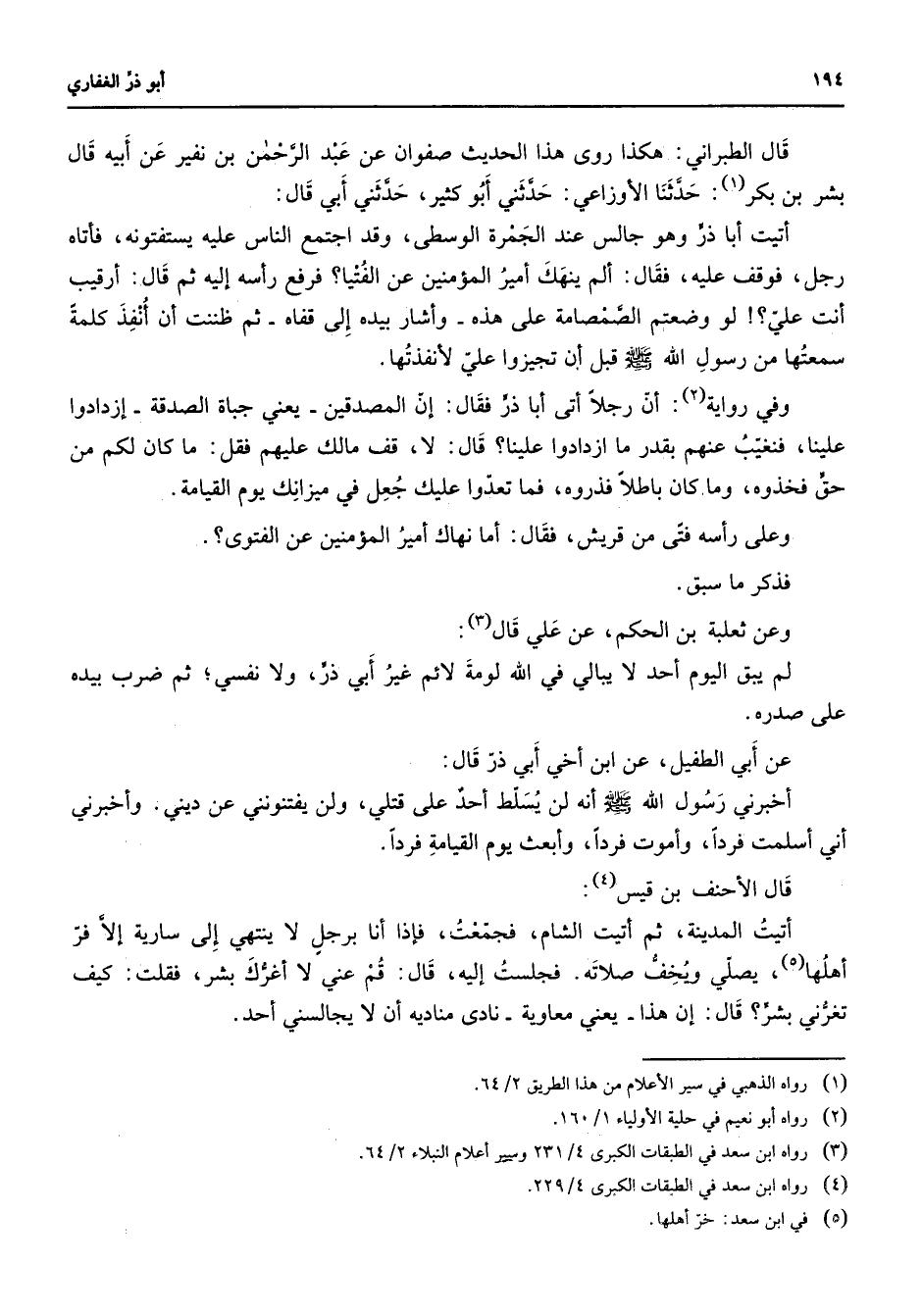 قال الطبراني هكذا روى هذا الحديث صفوان عن عبد الرحمن بن نفير عن أبيه قال بشر بن بكر (1) حدثنا الأوزاعي حدثني أبو كثير حدثني أبي قال أتيت أبا ذر وهو جالس عند الجمرة الوسطى وقد اجتمع الناس عليه يستفتونه فأتاه رجل فوقف عليه فقال ألم ينهك أمير المؤمنين عن الفتيا فرفع رأسه إليه ثم قال أرقيب أنت علي لو وضعتم الصمصامة على هذه وأشار بيده إلى قفاه ثم ظننت أن أنفذ كلمة سمعتها من رسول الله (صلى الله عليه وسلم) قبل أن تجيزوا علي لأنفذتها وفي رواية (2) أن رجلا أتى أبا ذر فقال إن المصدقين يعني جباة الصدقة إزدادوا علينا فنغيب عنهم بقدر ما ازدادوا علينا قال قف مالك عليهم فقل ما كان لكم من حق فخذوه وما كان باطلا فذروه فما تعدوا عليك جعل في ميزانك يوم القيامة وعلى رأسه فتى من قريش فقال أما نهاك أمير المؤمنين عن الفتوى فذكر ما سبق وعن ثعلبة بن الحكم عن علي قال (3) لم يبق اليوم أحد لا يبالي في الله لومة لائم غير أبي ذر ولا نفسي ثم ضرب بيده على صدره عن أبي الطفيل عن ابن أخي أبي ذر قال أخبرني رسول الله (صلى الله عليه وسلم) أنه لن يسلط أحد على قتلي ولن يفتنونني عن ديني وأخبرني أني أسلمت فردا وأموت فردا وأبعث يوم القيامة فردا قال الأحنف بن قيس (4) أتيت المدينة ثم أتيت الشام فجمعت فإذا أنا برجل لا ينتهي إلى سسارية إلا فر أهلها (5) يصلي ويخف صلاته فجلست إليه قال قم عني لا أغرك بشر فقلت كيف تغرني بشر قال إن هذا يعني معاوية نادى مناديه أن لا يجالسني أحد
